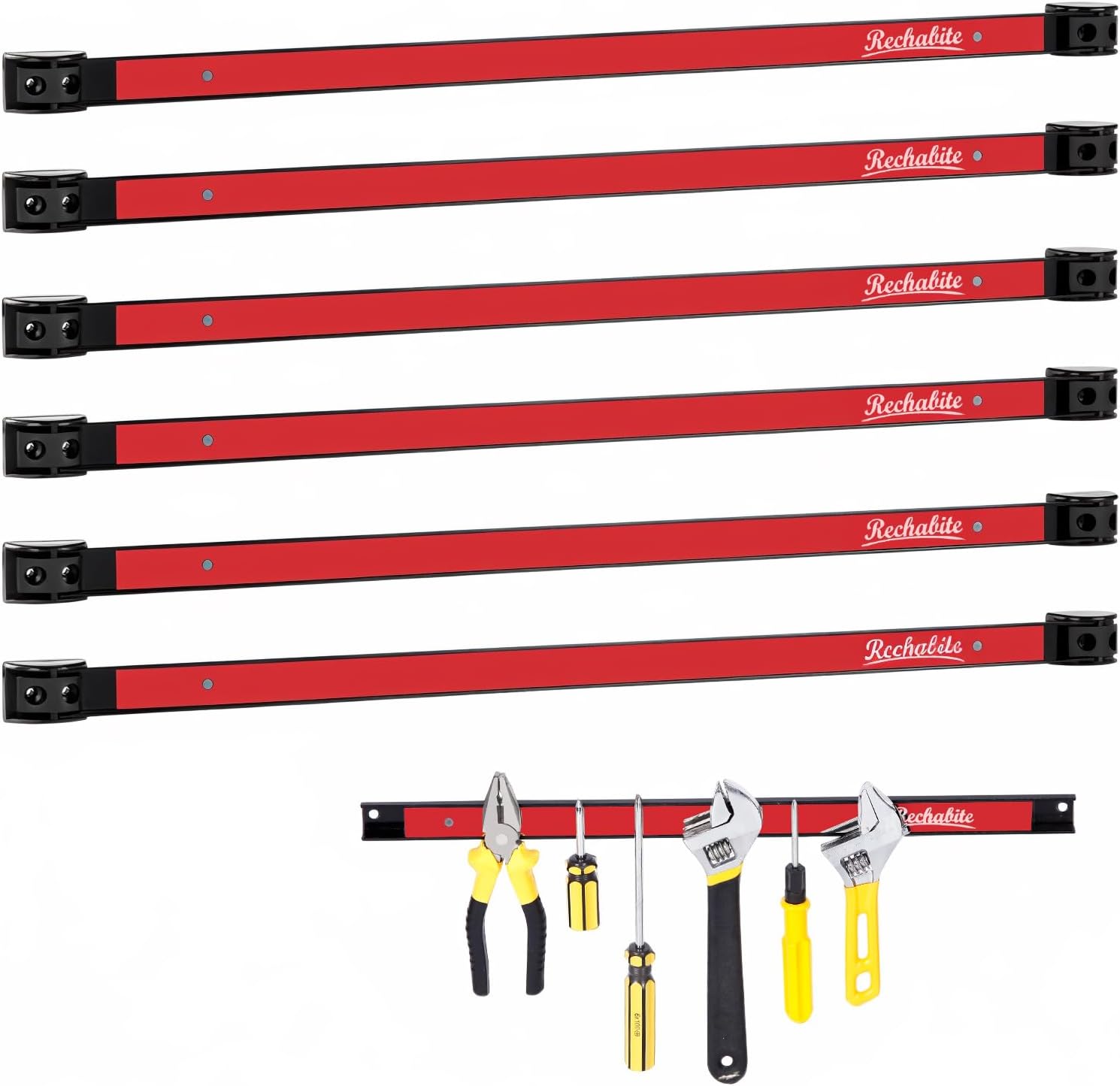 - MAGNETIC TOOL HOLDER SET: Rechabite magnet tool organizer set includes 6 pieces 24" magnetic tool bars, comes with 12 mounting brackets, screws and anchors. Each magnetic tool strip is extendable with each other connected.