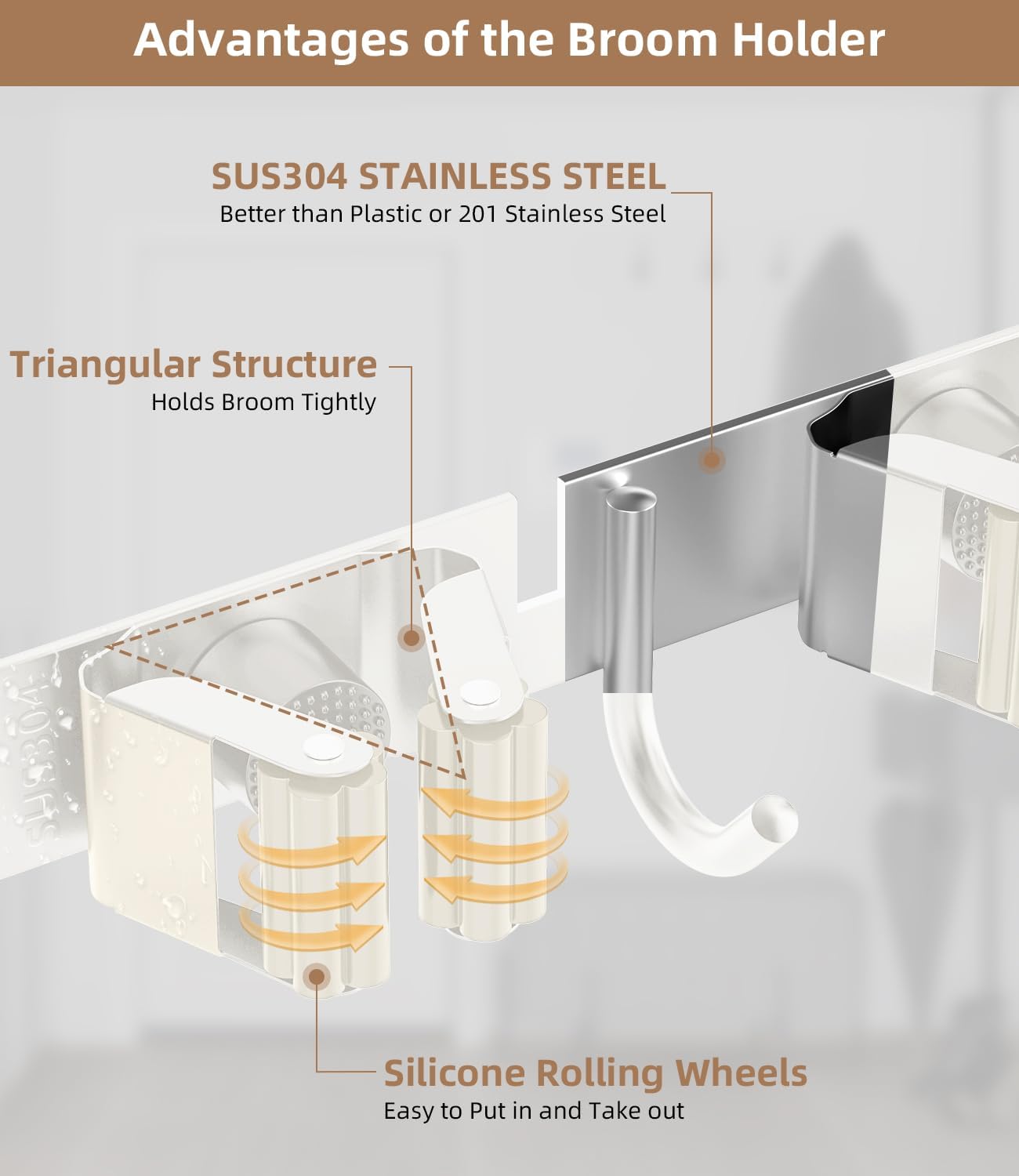 Broom Holder Over The Door - 304 Stainless Steel Mop and Broom Holder Wall Mounted or Hanging Over The Door with Hooks - Broom Hanger - white, Broom Storage Tool Organizer for Closet Laundry