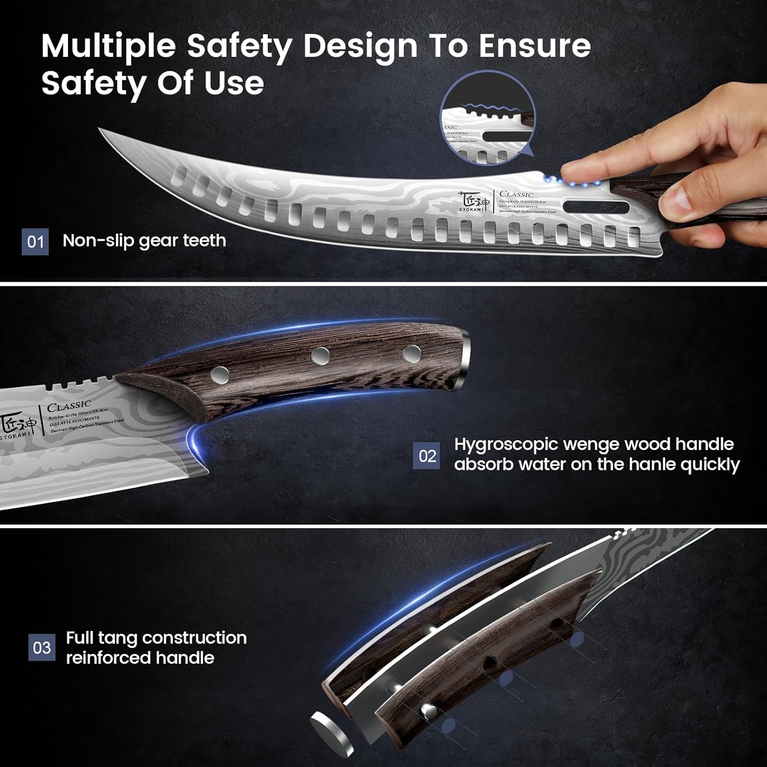 - Fourfold security protection: The combination of WENGE WOOD and GEAR TEETH design provides double protection to ensure non-slip, keeping you safe while handling food. Forged from a SINGLE-PIECE, built with TRIPLE-RIVETED strength and durability, it withstands high-intensity tasks