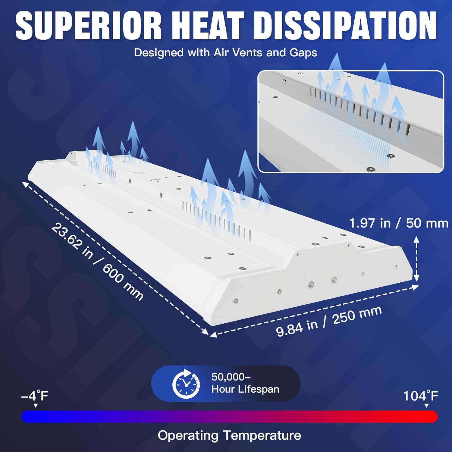 - 【Superb Heat Radiation】The linear highbay workshop light has a great heat dissipation design. Its anti-rust aviation aluminum housing has multiple heat dissipation holes. This design gives it remarkable heat dissipation capabilities, ensuring a 50,000-hour lifespan (8 hours daily use equals 17 years).
