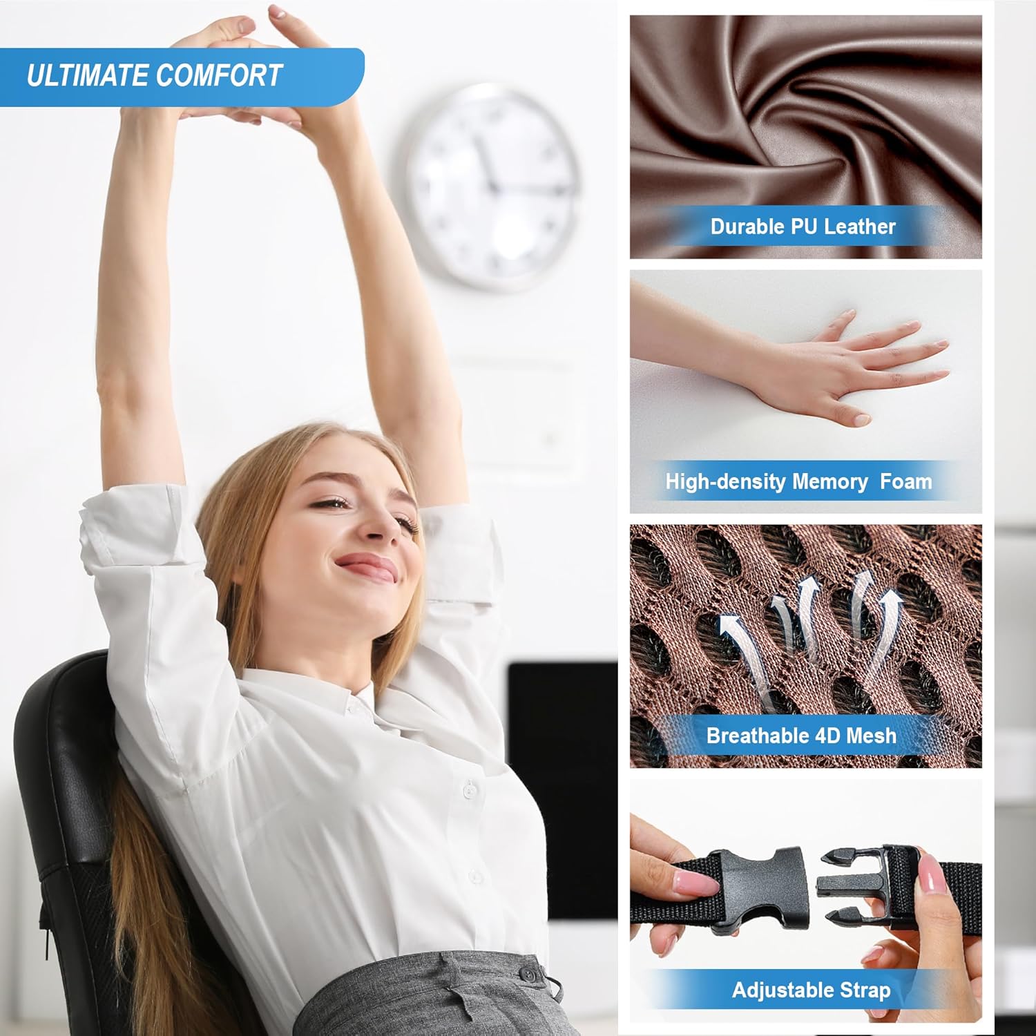 - Premium Quality - Durable PU leather can be used for a long time, maintaining an elegant appearance and easy to clean; breathable 4D mesh. Car back support ensures ultimate comfort for the driver during long-time driving. Pillow offers consistent support, style, and quality