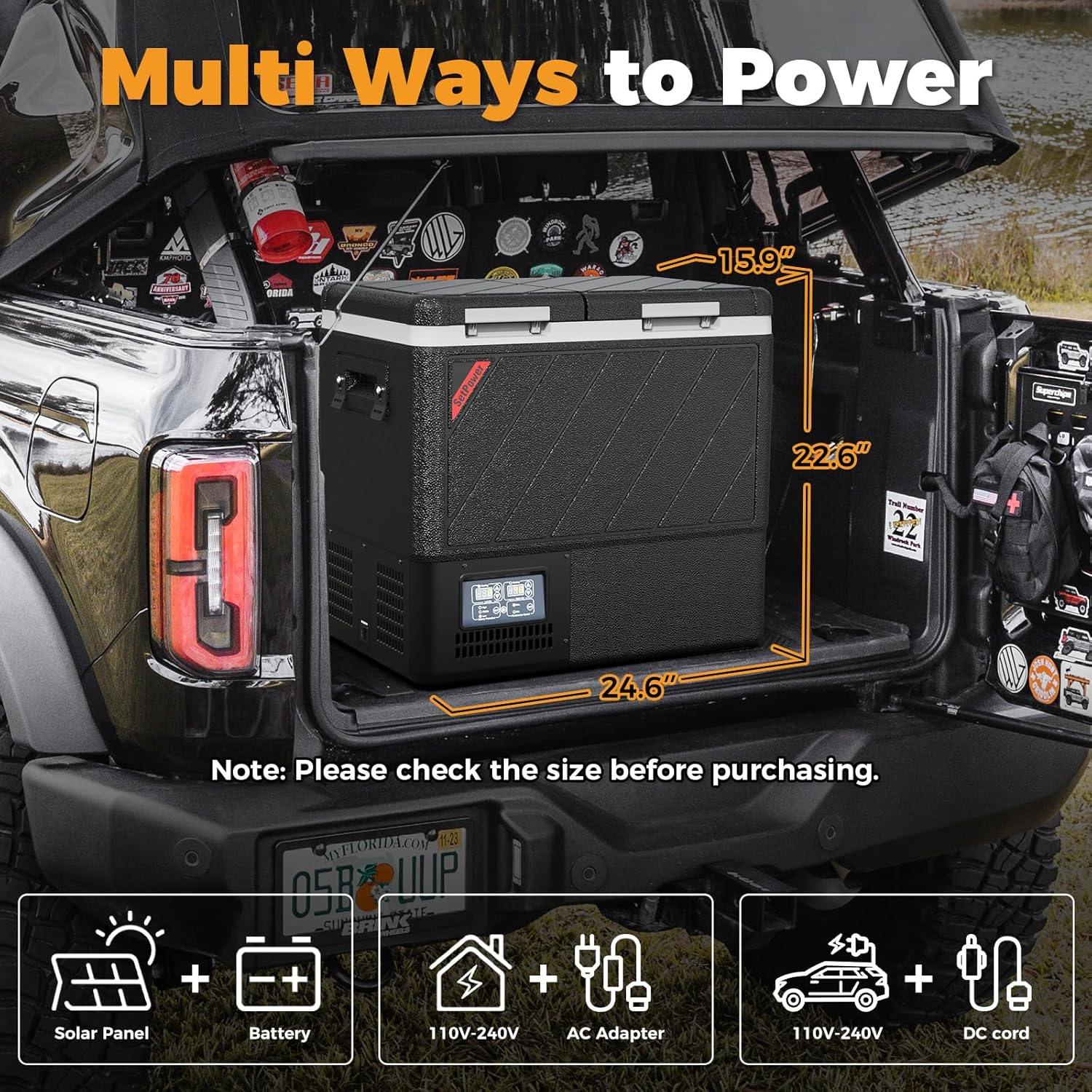 - Convenient APP Control: Take full control of your portable refrigerator with our advanced APP Control feature. This 12v refrigerator lets you setting and checking the portable refrigerator all from your smartphone. No need to worry about your food in the fridge, which has a large capacity. The size is 24.6*15.9*22.6 inches, the small zone is 23QT and the large zone is 36QT, which can hold 78 cans of cola or 37 bottles of water or 19 bottles of wine