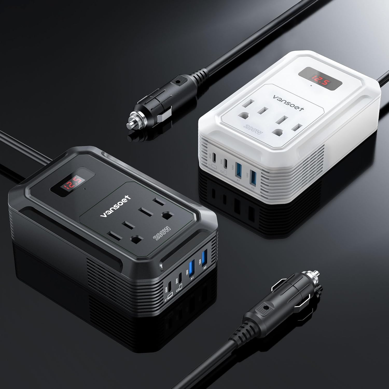 - Vansoet Advantage: America's leading power inverter brand. Provides 200 Watts continuous DC 12v to AC 110v power inverter featuring 2xPD (65W/30W)&2xQC 18W USB ports, 2 AC outlets, and a 23.8-inch cable with cigarette lighter plug and LCD Display for you, more convenient.