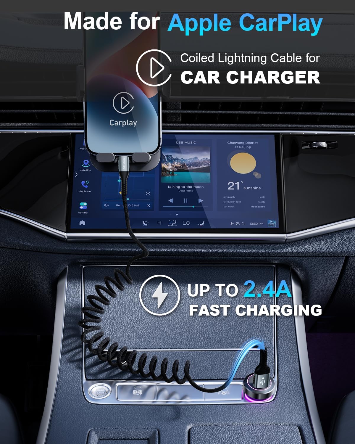 USB to Lightning Cable for Car 6FT, Coiled iPhone Charger Braided Lightning Cable [Apple MFi Certified] Fast Charging Cord Compatible with iPhone 14 Pro/Pro Max/Plus 13 12 11 8 7, iPad AirPods