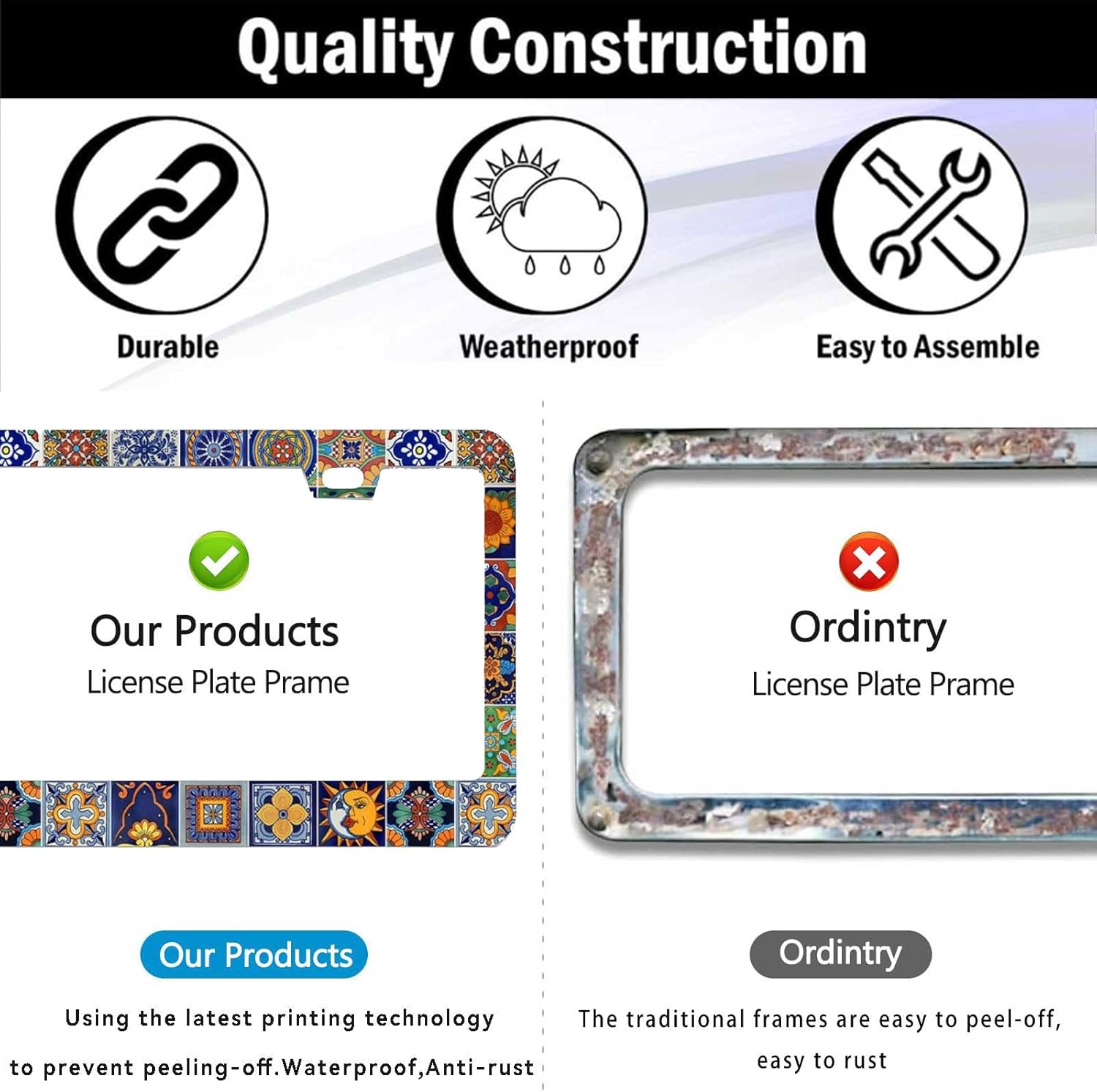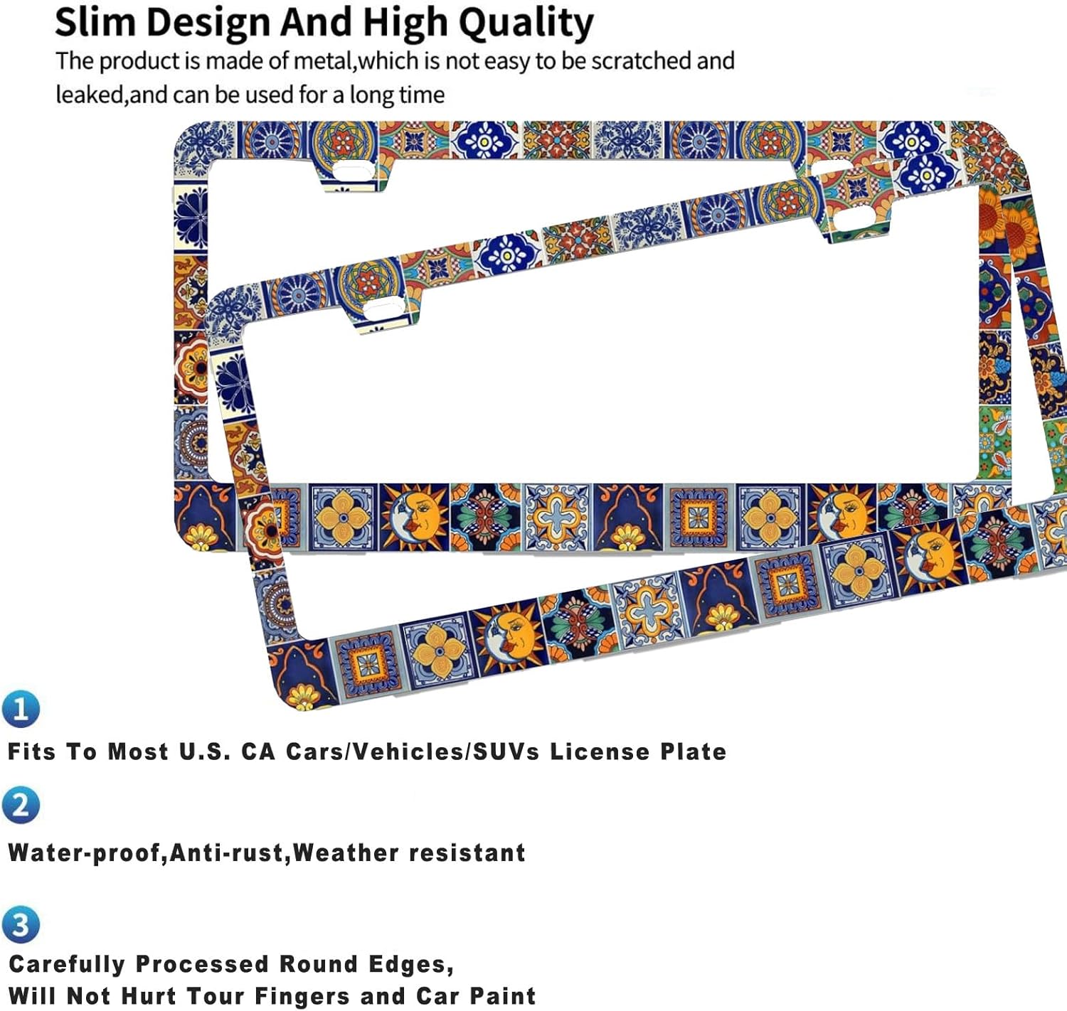 - DURABLE CONSTRUCTION: Made from premium quality metal with weather-resistant coating.Rain or Shine, Stay Secure – Our Rust-Proof Mexican Tiles Boho License Plate Cover Frame Won’t Budge at Any Speed!