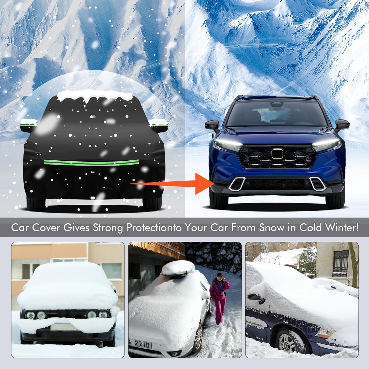 - đăSafety and Humanizationăâ The car protection cover has 2 zippers on the front door sides to facilitate temporary access to items; âĄThe 4 reflective strips are located at the front, rear and the two side mirrors of the car to prevent nighttime collisions and other accidents; â˘Custom fit shape with 2 mirror pockets for all-around protection.