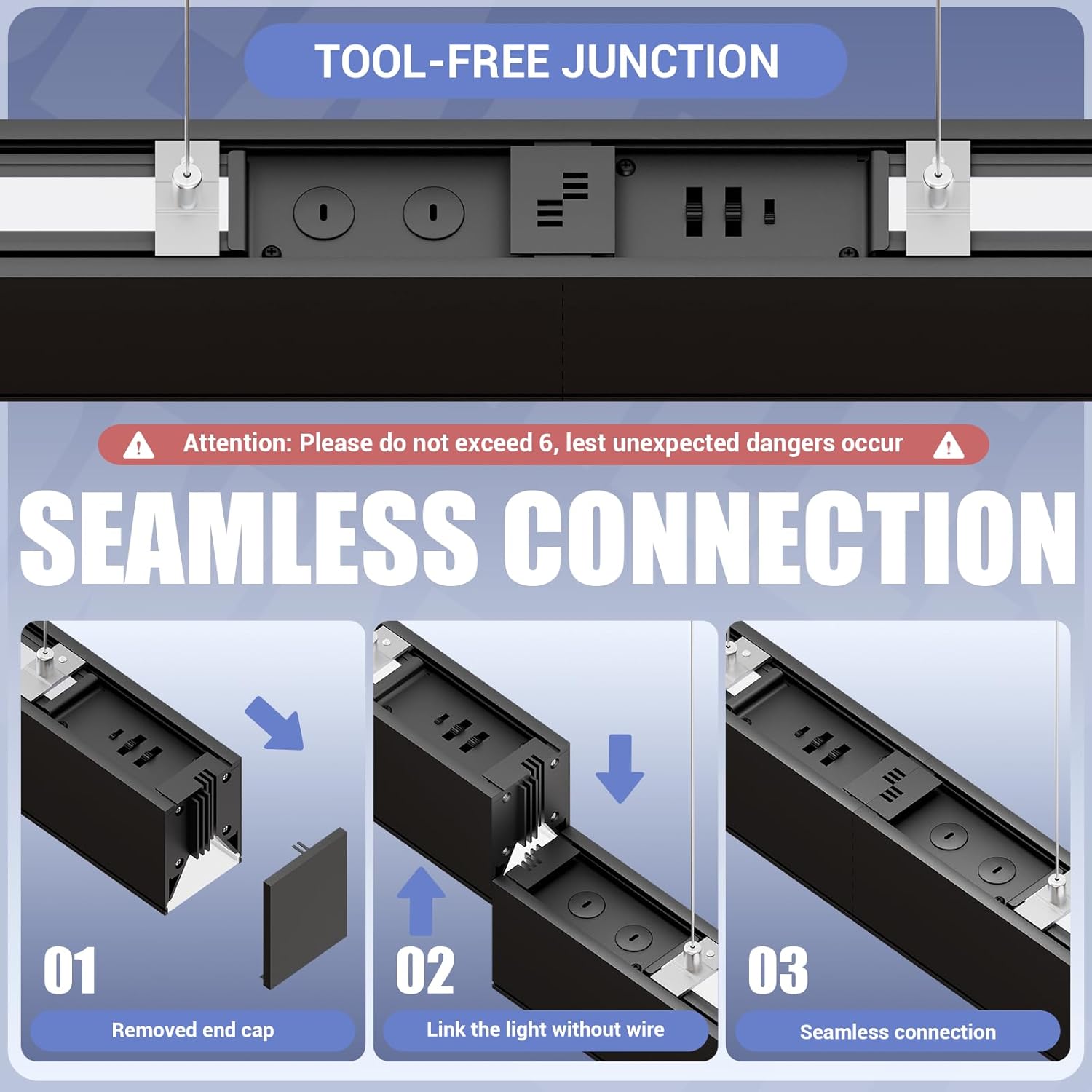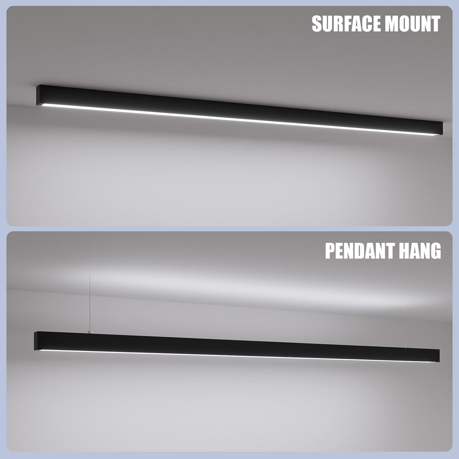 - COMMERCIAL GRADE BUILT TO LAST: linear pendant light and glare-free design produces soft and even lighting. Die-cast Aluminum housing for light weight and fast heat sink. All accessories included for suspension mount. It is easy to adjust hanging height from 0in~5ft. combining functionality with a modern touch.