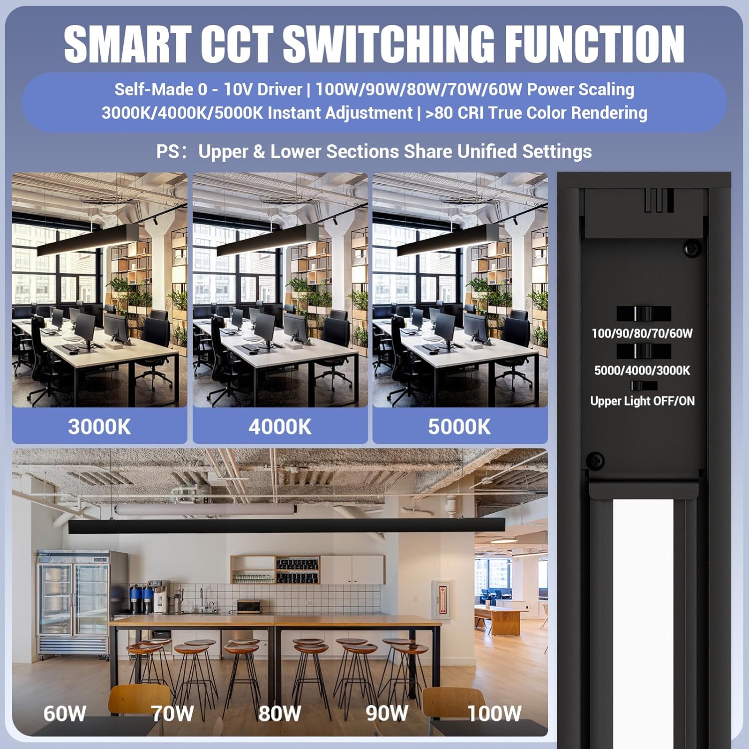 - 100/90/80/70/60W DIMMABLE: The linear lights comes with a powerful 100/90/80/70/60W selectable output delivering 12000 lumens of brightness, you can enjoy superior illumination to enhance productivity and visibility in your workspace. By replacing 200W old fluorescent, 120-277V, save 75% energy.