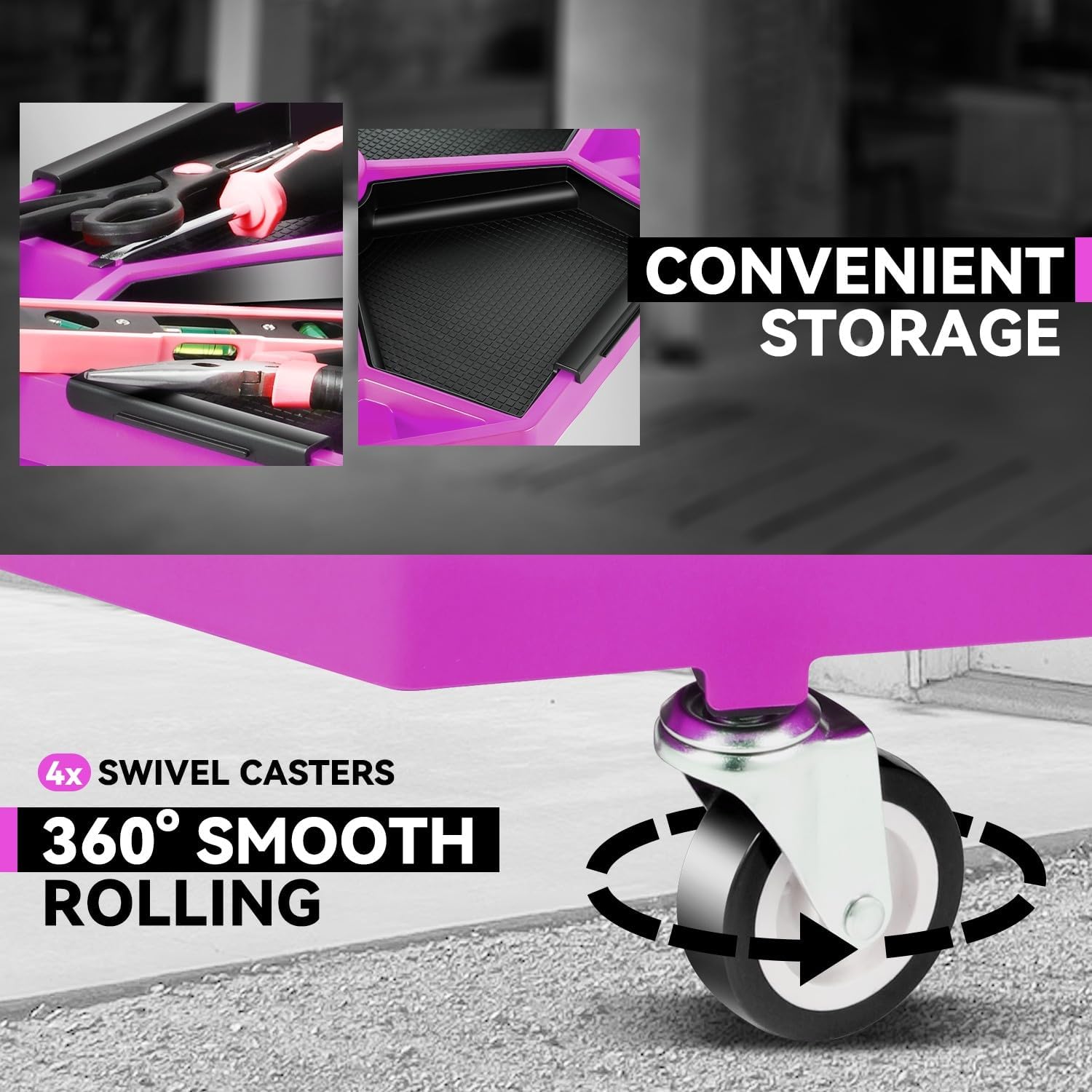 - 【Enhanced Mobility】Equipped with 4 swivel casters, this mechanic stool provides smooth and precise maneuverability around your garage, streamlining your work process.