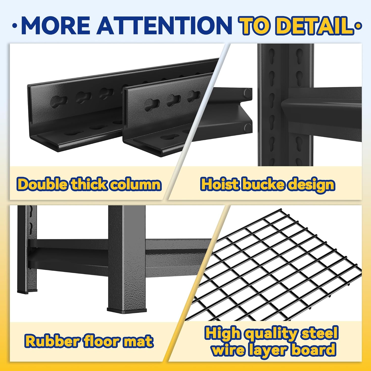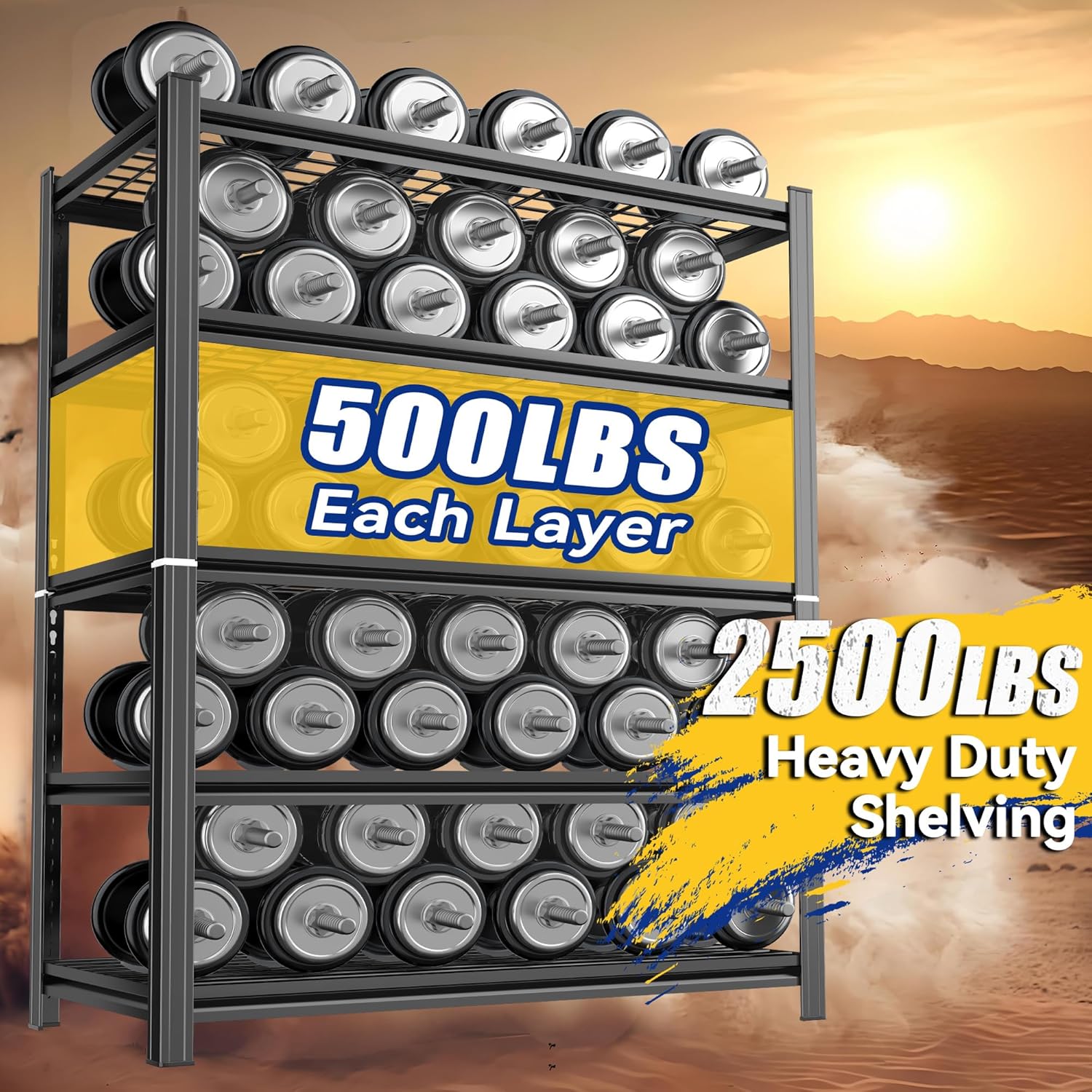 - 【2500 lbs Load Capacity】Constructed with robust steel and double metal legs, this shelving unit supports up to 2500 lbs in total (with 500 lbs per shelf), ensuring reliable storage for heavy items. Unlike traditional particle board, this heavy-duty design provides unmatched durability and stability for even the bulkiest goods.