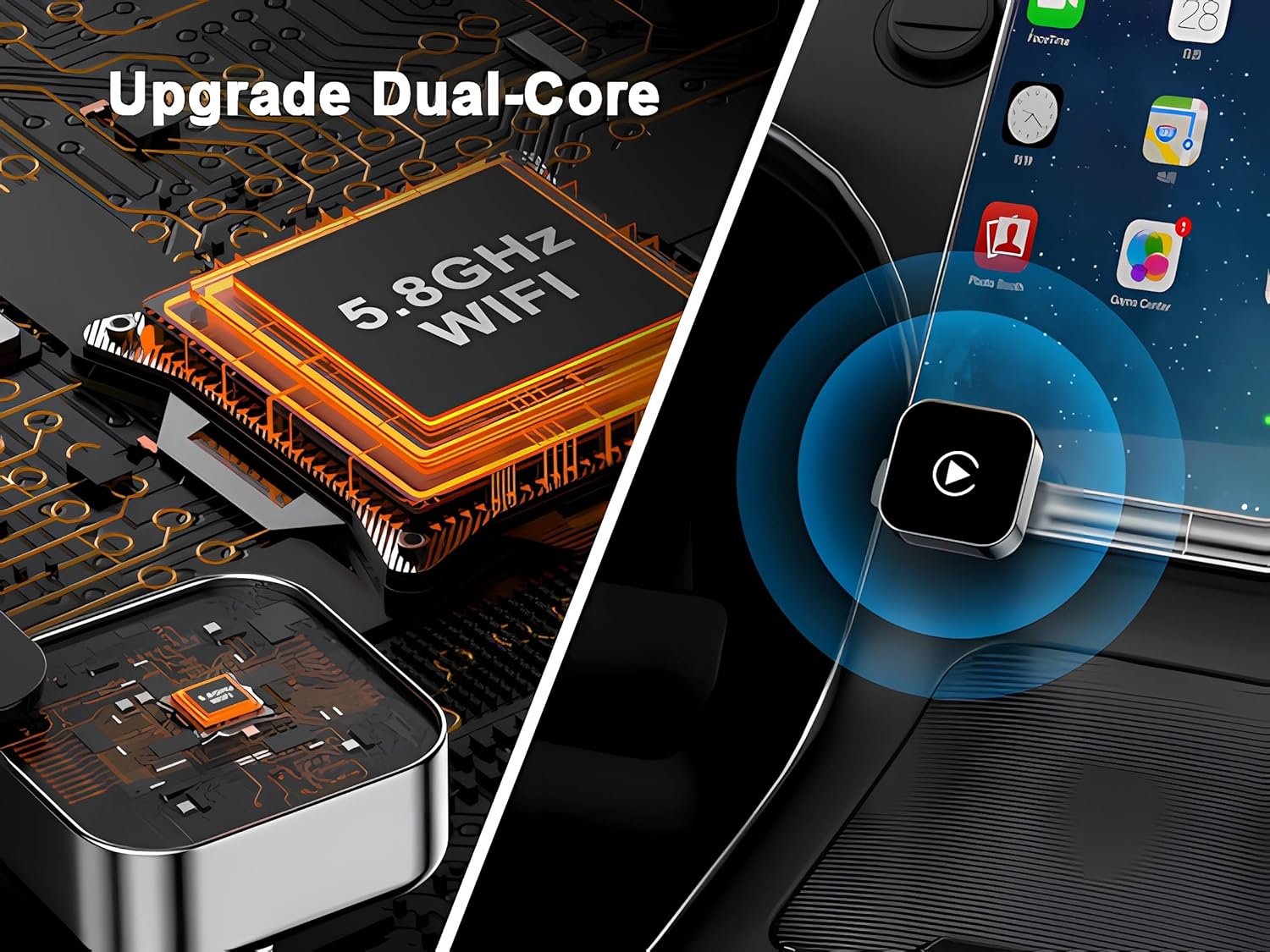 - 【Lightning-Fast Connectivity】 Our wireless apple carplay adapter equipped with the latest 5.8 GHz WiFi, Bluetooth 5.3, and a next-gen chip. Complete the first connection in 10s and auto-connect in 3s with zero daily usage delay. Experience transmission speeds 3 times faster than other adapters. Enjoy smoother usage that enhances every safe drive. Navigate, play music, take calls, and handle messages easily through Siri, touchscreen, buttons, or knobs, making focused driving truly achievable.