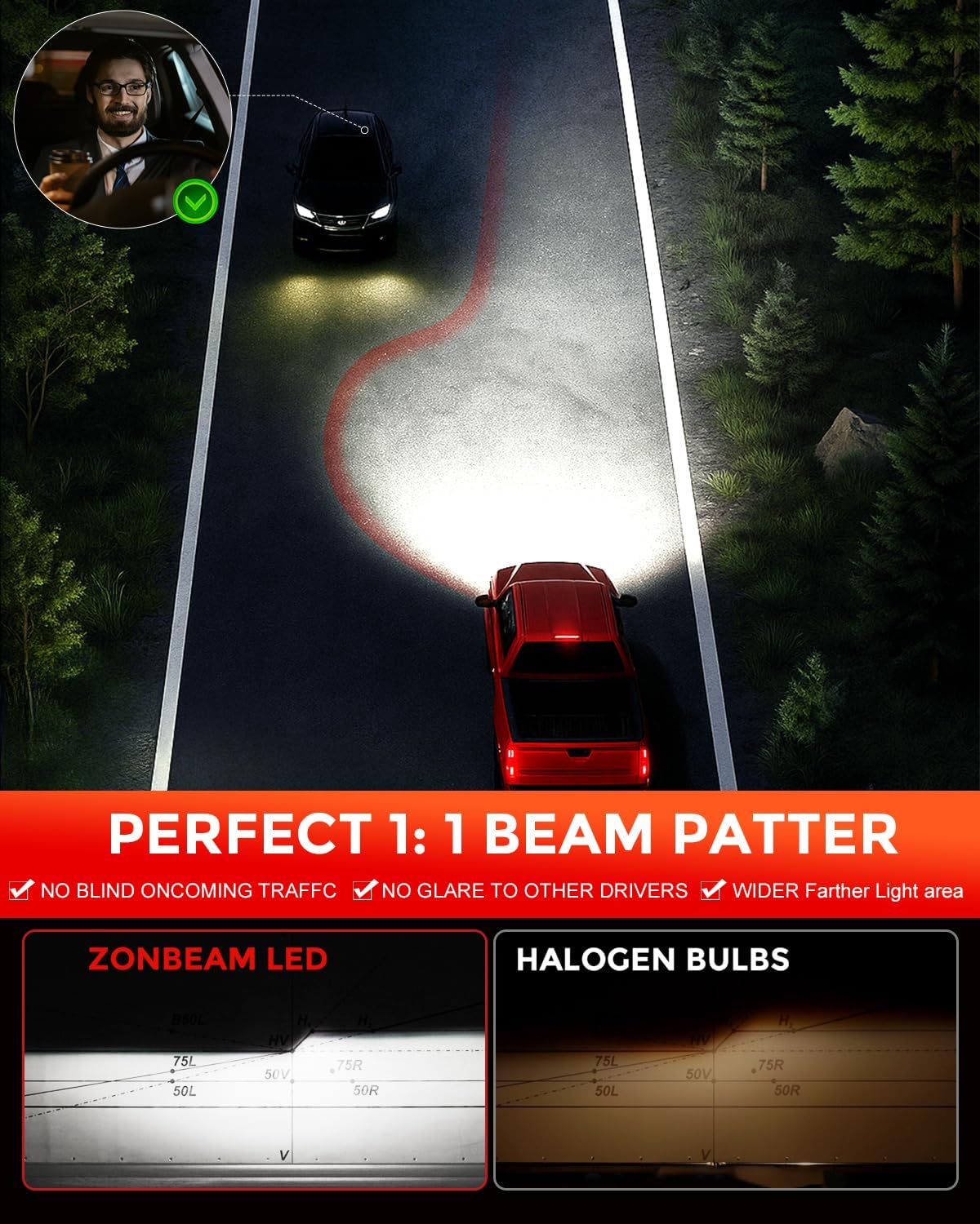 - [Super-Bright 80000LM] 2025 ZONBEAM led bulbs with 80000lm ultra-high lumen output per group compared to halogen and 6000k cool white light, illuminates all the details on the roadway at night, making night driving more comfortable and safer.