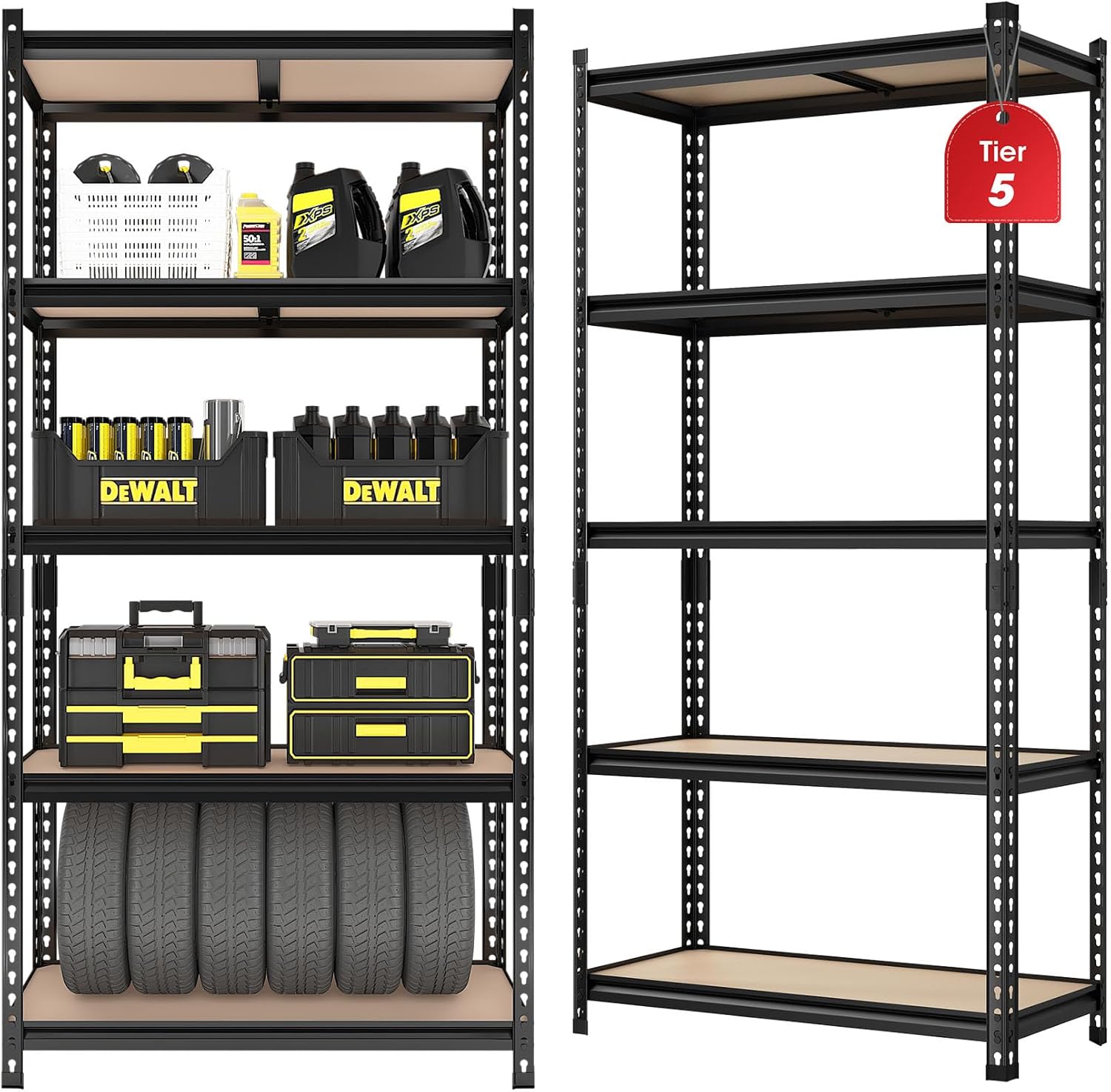 - Heavy Duty & Long-Lasting: This 5-tier garage shelving unit is made of high-quality MDF boards and a thicker heavy-duty galvanized metal frame, ensuring garage storage is sturdy and durable. Each tier can hold up to 300 lbs, with a total maximum load capacity of 1500 lbs for the entire shelf, making it perfect for all your metal heavy duty shelving needs. Please note, for your safety, do not overload this pantry garage shelves.