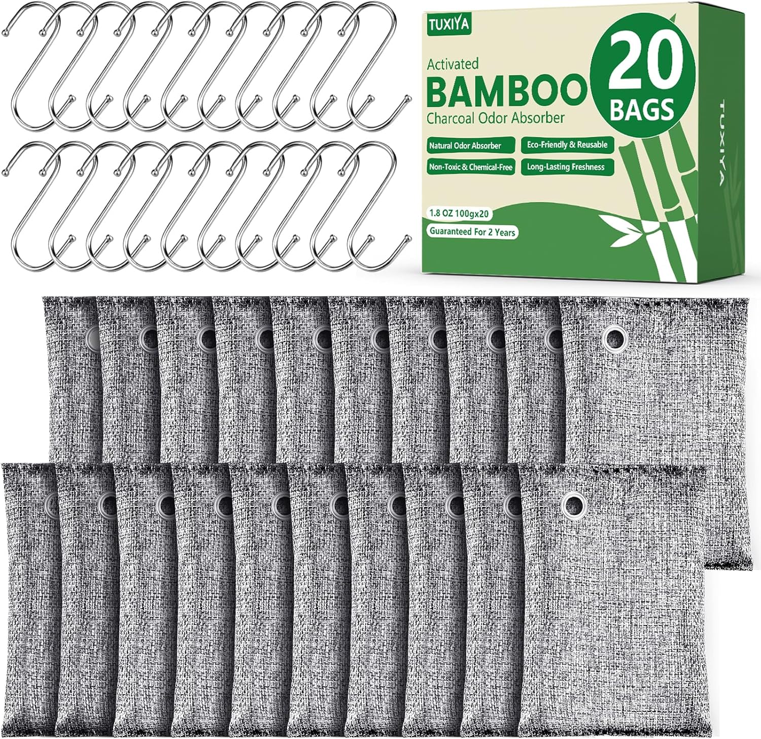 - 【Activated Charcoal】:This set includes 20 charcoal deodorizer bags (100g each) with hooks, designed to naturally absorb odors and moisture for a fresher environment.