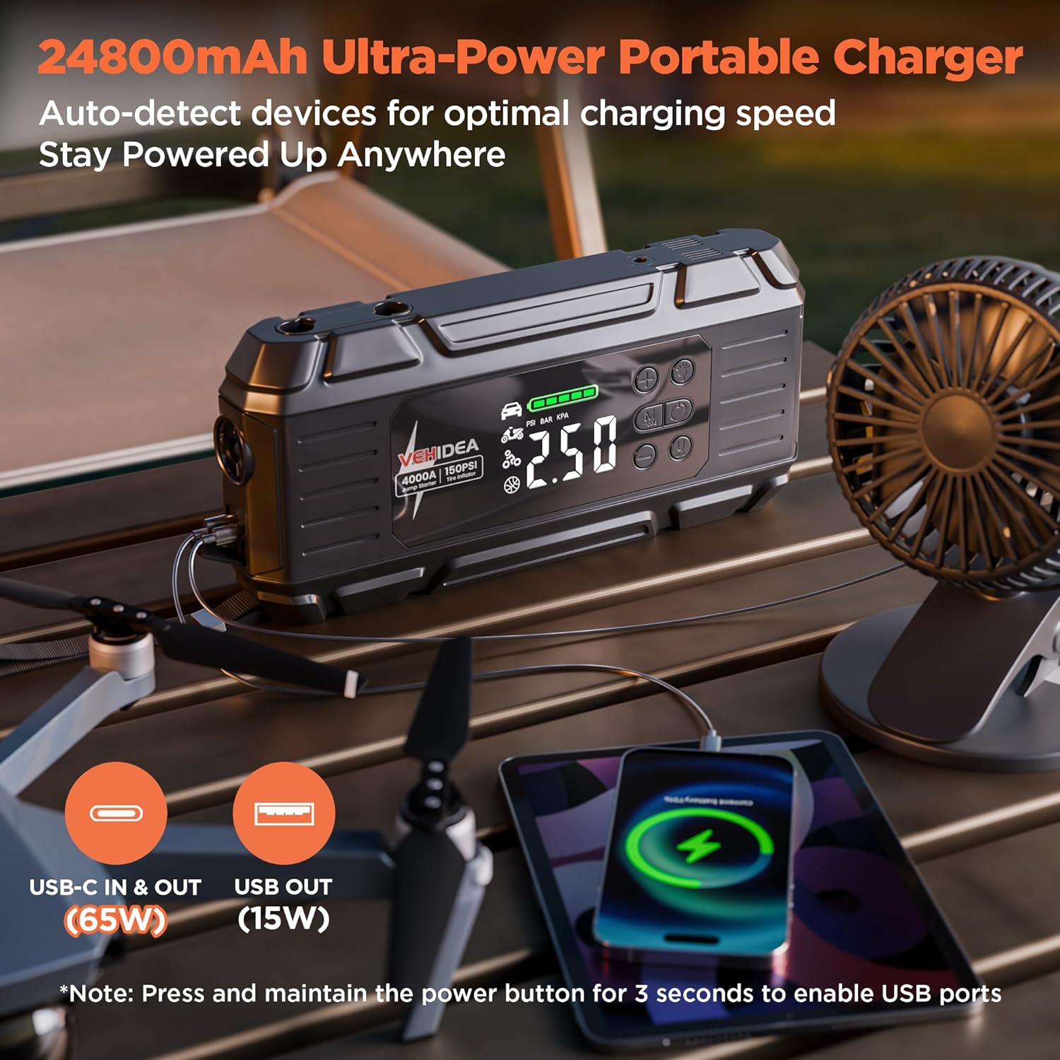 - 65W+18W Fast Charging: This 26800mAh car jump starter features 65W USB-C bi-directional fast charging, allowing it to charge from 0% to 80% in just 1 hour. Get your car running in as little as 5 minutes. It also provides 4X faster phone charging and supports laptop power. Plus, an 18W USB fast output allows you to charge multiple devices simultaneously. Perfect for your on-the-go lifestyle
