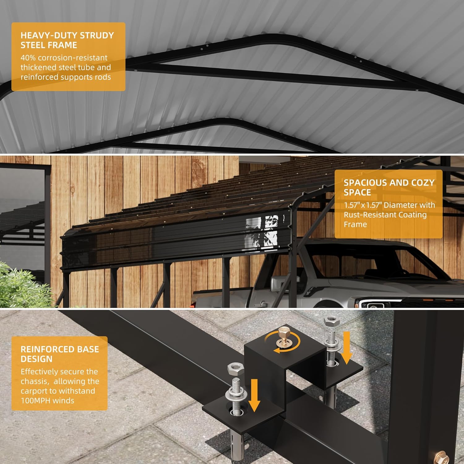 - UPGRADED AND ENHANCED BASE - For stability purposes, the metal carport is equipped with heavy-duty anchor rods. Moreover, it has six reinforcing support rods that can be installed on different surfaces, ensuring outstanding stability and durability even in tough weather. The metal roof of the car port is made of galvanized steel, which is rust-proof and very durable. The upgraded sloping canopy enables quick water drainage