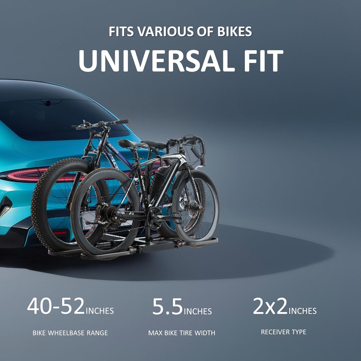 - Fits 2 Heavy-Duty Bikes: Elevate your outdoor trips with our robust aluminum hitch bike rack. It supports 40-52” wheelbase, tires up to 5.5”, and total 2-bike weight of 200 pounds. This makes it an excellent fat tire bike rack, and secure ebike rack. It also carries mountain, road, fat-tire ebike, electric bicycles etc.