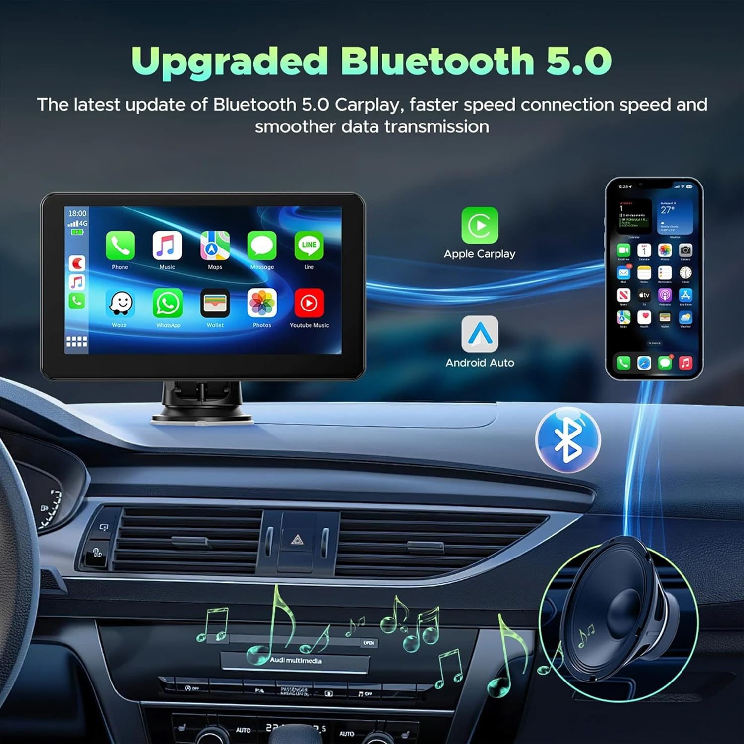Portable Wireless CarPlay and Android Auto Screen for Car, 7" HD Touch Screen Car Stereo with Mirror Link, Bluetooth 5.0, Backup Camera, AUX,FM Transmitter for All Vehicle (with Camera)
