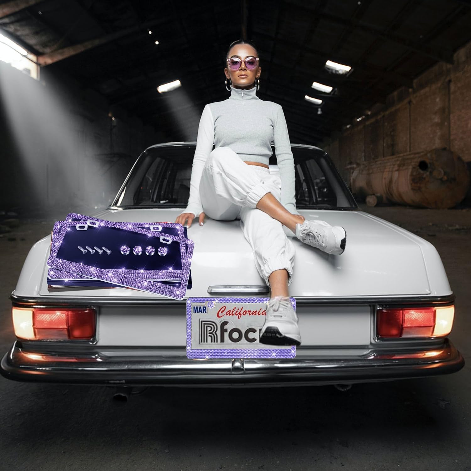 2 Pack License Plate Frames for Women, Sparkly Rhinestone Diamond Car Accessories with Glitter Crystal Caps (Purple (2PCS))