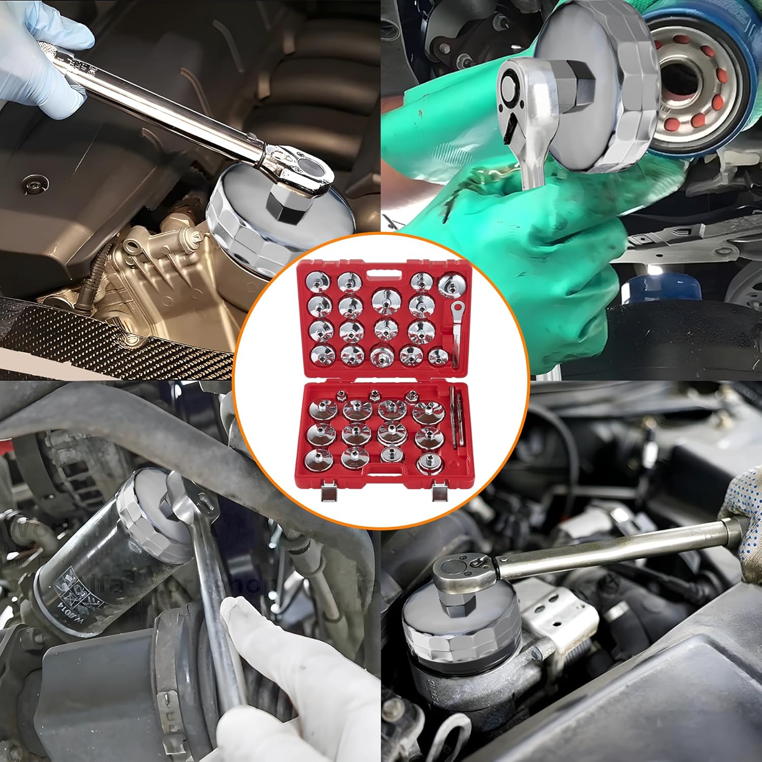 Auto Oil Filter Socket Wrench Set, Cup Type 1/2 inch Drive Cap Removal Tool, with Drain Plug Socket Set/Adjustable/Drive, Compatible, all Models Car, SUV, Oil Filter (35, RED)