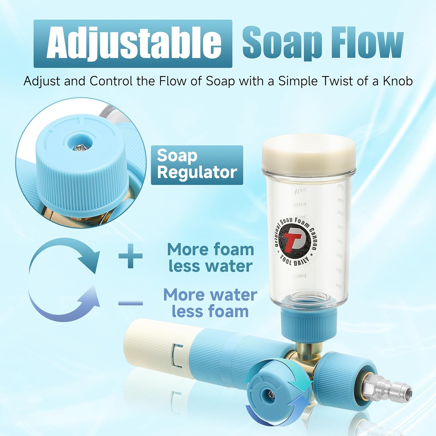 - ADJUSTABLE ANGLE & FLOW: This foam cannon for pressure washer features a fully adjustable nozzle, giving you control over the spray pattern and direction. The side knob allows you to adjust the amount of soap, turning it clockwise means more foam, less water, anticlockwise rotation is the opposite. With a bottle capacity of 100 ml, it’s lightweight and easy to use. Max working pressure: 3600 PSI
