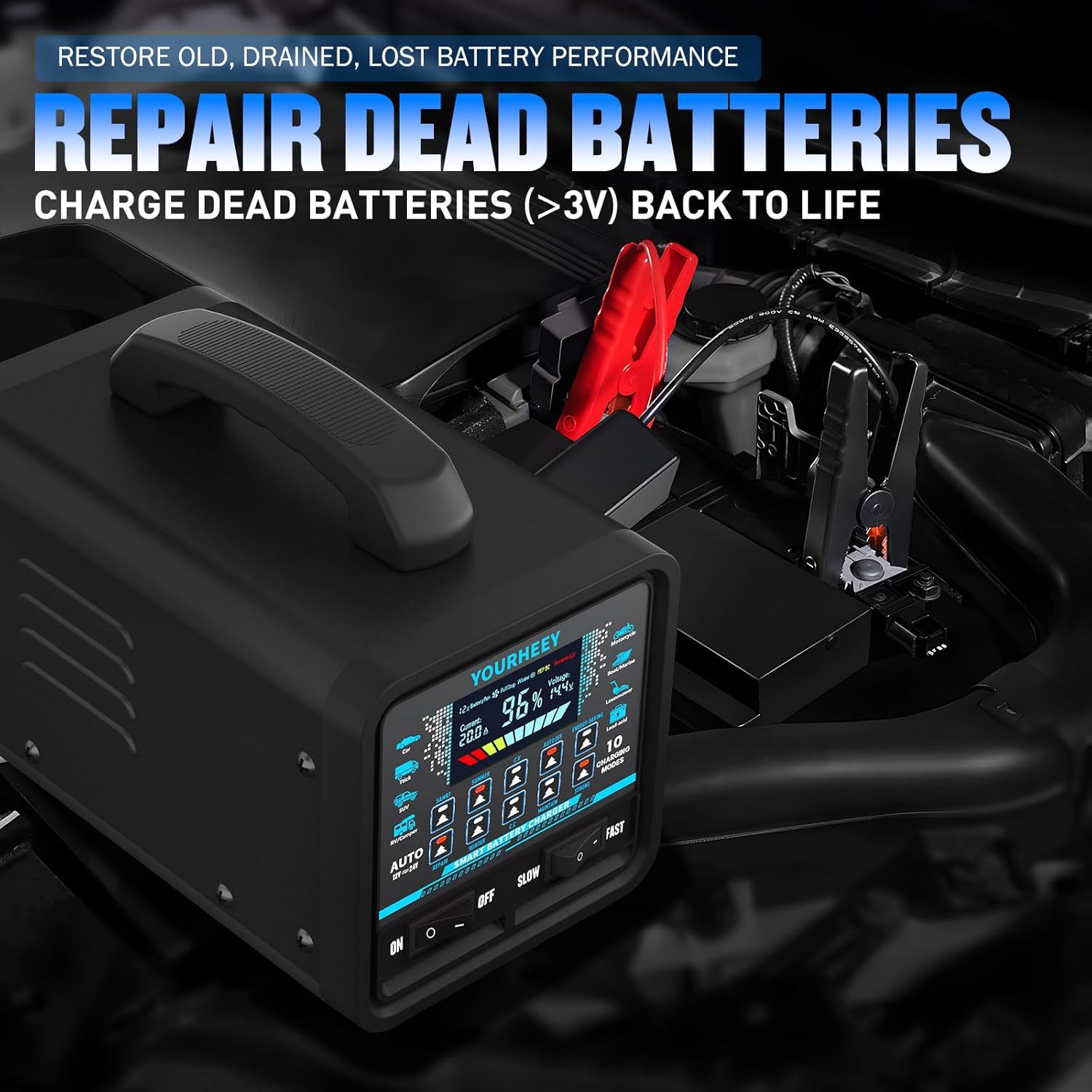- 【Professional-Grade Battery Charger】Engineered with military-grade 13.1LB pure copper coils and heavy-duty aluminum alloy casing, the Yourheey Car Battery Charger delivers unmatched durability and 30% faster heat dissipation. This 12V 24V Battery Charger Automotive masterfully handles all lead-acid battery types - AGM, GEL, Flooded, EFB, Calcium, MF, and deep-cycle batteries (Note: Not compatible with lithium/LiFePO4). Its 20A max output ensures rapid charging for trucks/RVs while maintaining precision for motorcycles/lawn equipment. car battery charger heavy duty battery maintainer trickle charger
