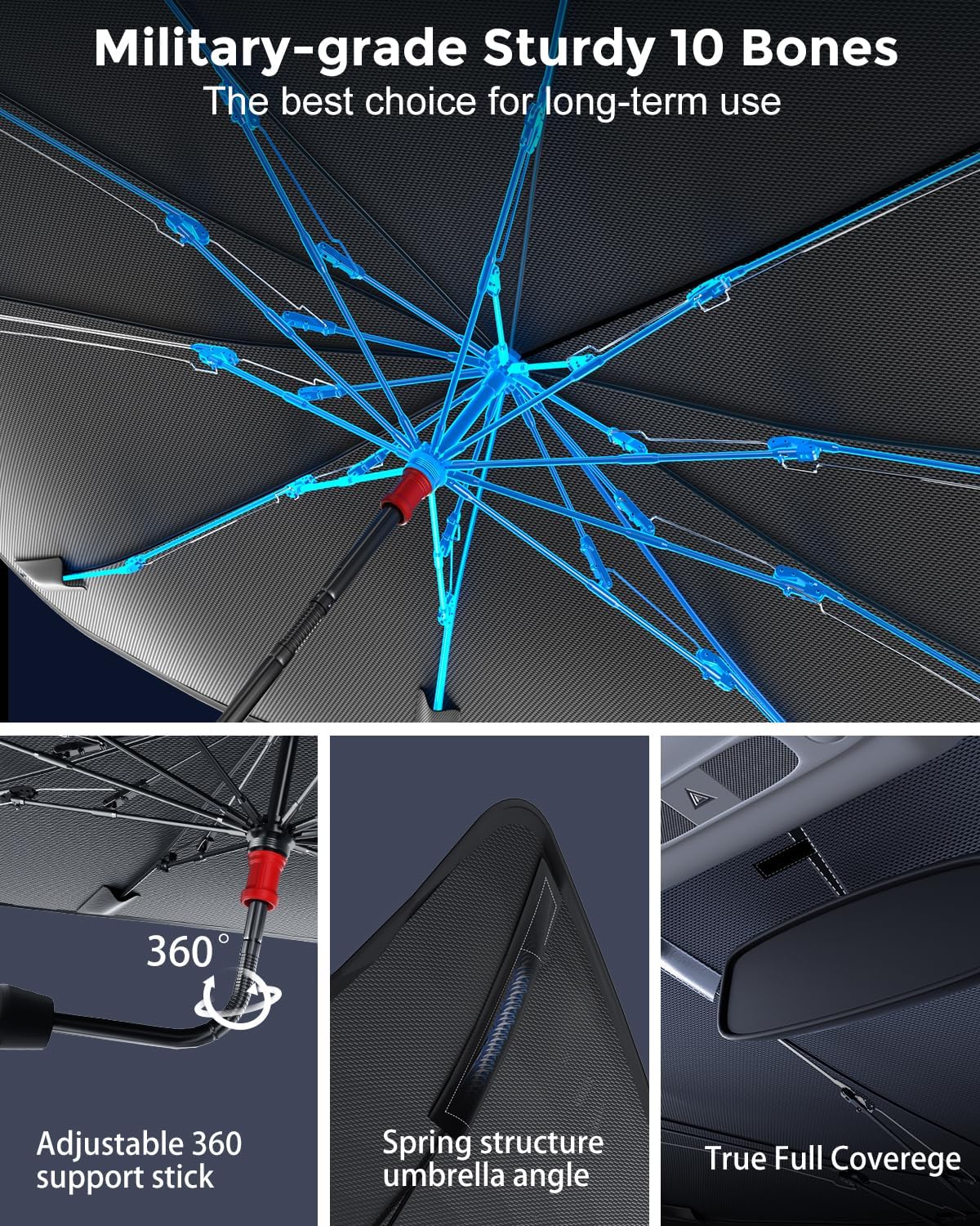 - [2025 Updated Version] - Combine double-layer cooling Sik material with reflective Vinyl Coating to achieve 0%-transmittance and efficient cooling of the product. Creating the better driving experience for you on summer. Whether you are on vacation, going to the beach, going to work, going to school, or going anywhere, You can rest-assured to park anywhere outdoors. Because our umbrella sunshade for car windshield can effectively protect your car from the sun and keep your car cool.