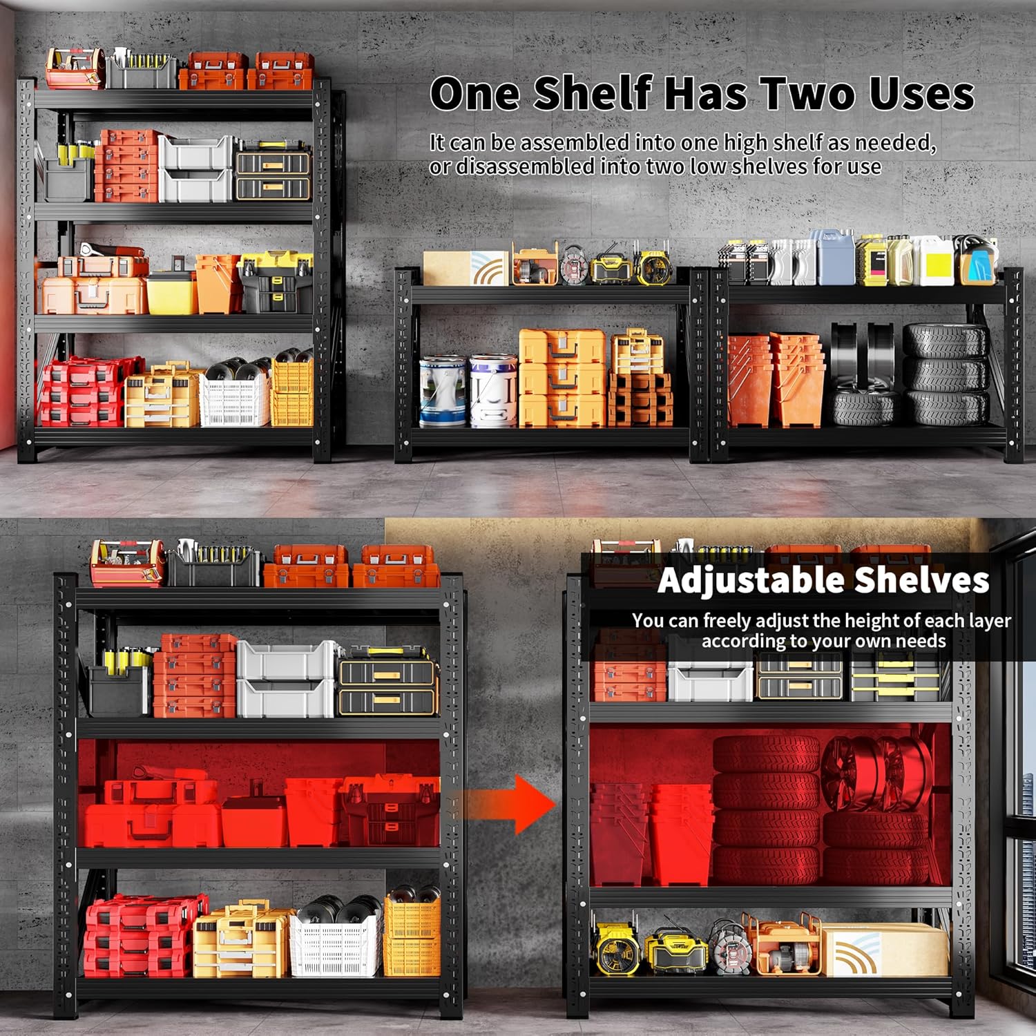 - 4000 LBS Heavy Duty Garage Shelving: Our garage shelving are made of all-metal and feature a triangular mechanical design at both ends to enhance stability. The garage shelves are connected by screws and lock pins. There are multiple reinforcing ribs on the back of the metal shelving, which greatly enhance the load-bearing capacity. The total load capacity of the garage shelf unit is 4,000 pounds. It is very suitable for storing heavy objects such as tires, generators, and oil tanks.