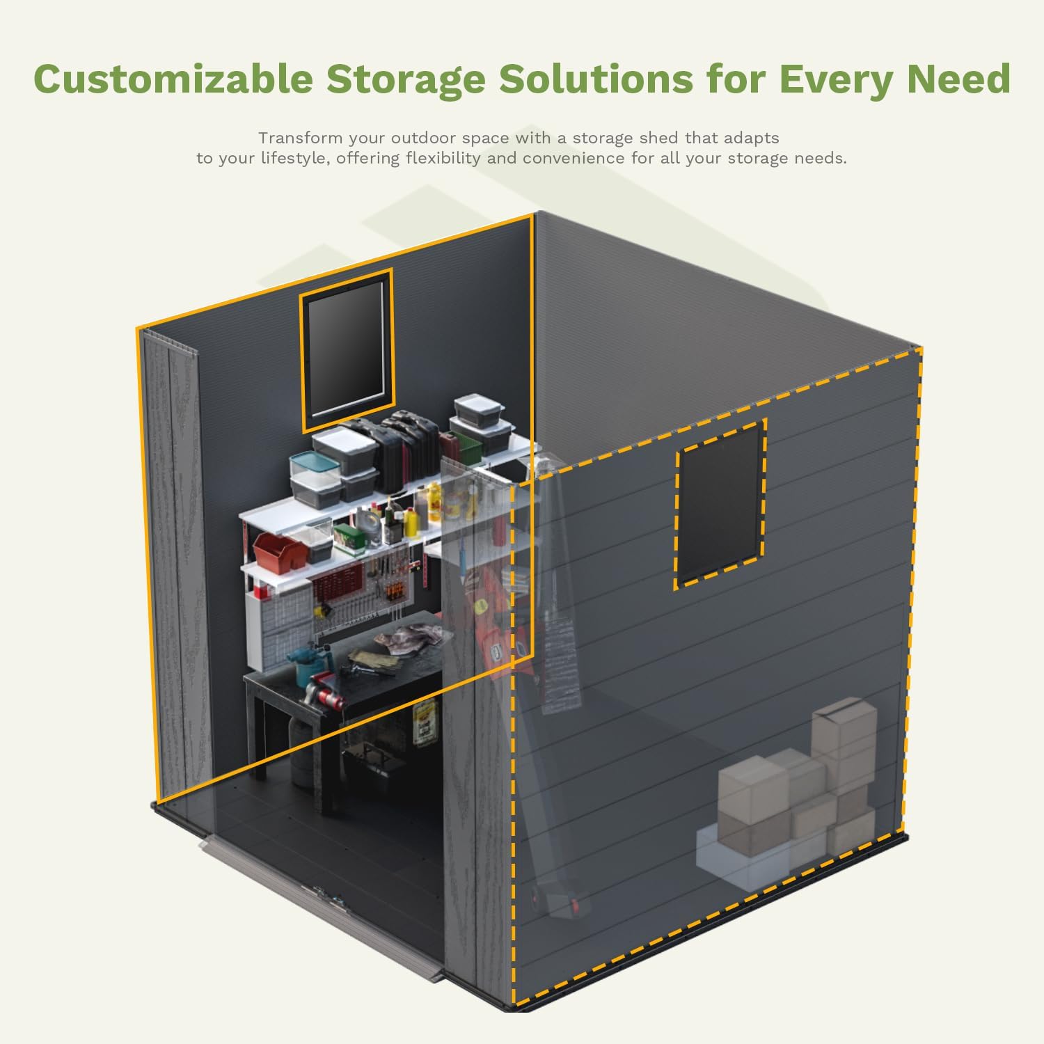 - Spacious & Versatile Storage: Measuring 72.6"L x 72.6"W x 83"H, the Patiowell 6 x 6 FT Shed offers 162 Cu.ft of ample space for garden tools, bikes, lawn mowers, and patio furniture. Its high ceiling and open layout maximize vertical and horizontal space, ideal for organizing bulky items while doubling as a greenhouse or pet shelter.