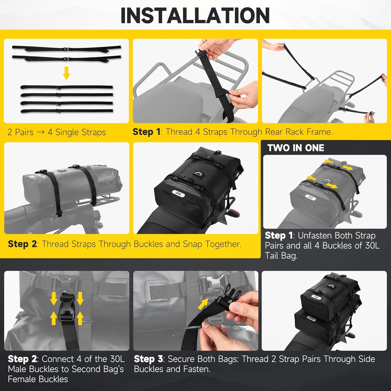 - Rider-Optimized Functional Design. The Gurblofy motorcycle tail bag is engineered with the rider in mind: Its heavy-duty PVC construction withstands all weather conditions, while storm-proof zippers ensure secure closure. The pack features quick-adjust buckles for instant sizing, and our patented textured handle design delivers a firm grip even with gloves. Multi-position straps distribute weight evenly across your back for fatigue-free riding adventures.