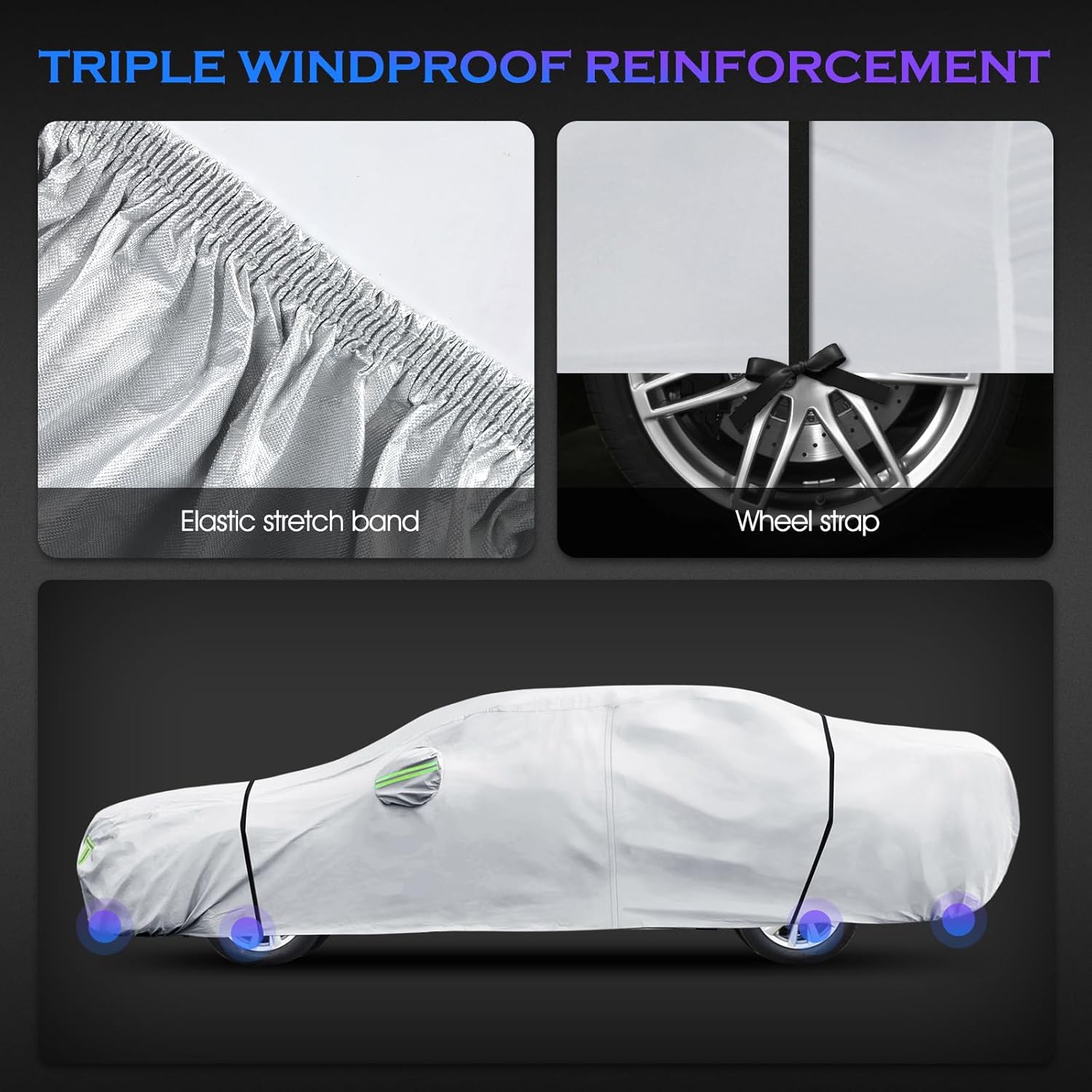 - 【Convenient and save time and space】: Our car cover easy to install and remove, making it convenient to use. and with a waterproof bag, making it easy to fold and carry in your trunk without taking up extra space;Accessible door zipper,easy entry into the vehicle.