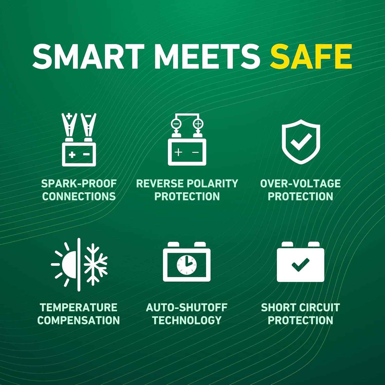 - Advanced Safety Features: Built-in spark-proof connections, reverse polarity protection, temperature compensation, and microprocessor-controlled charging for worry-free operation.