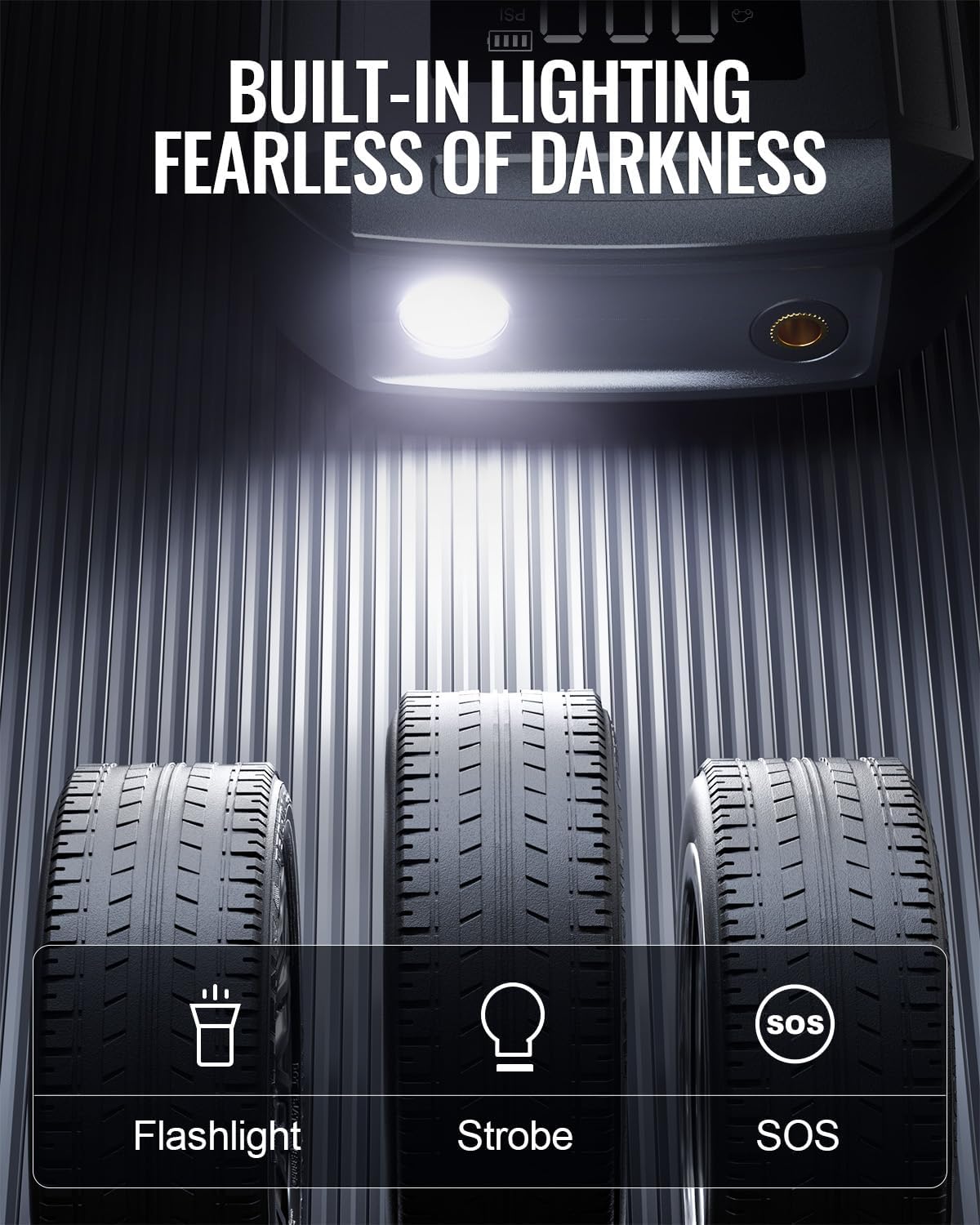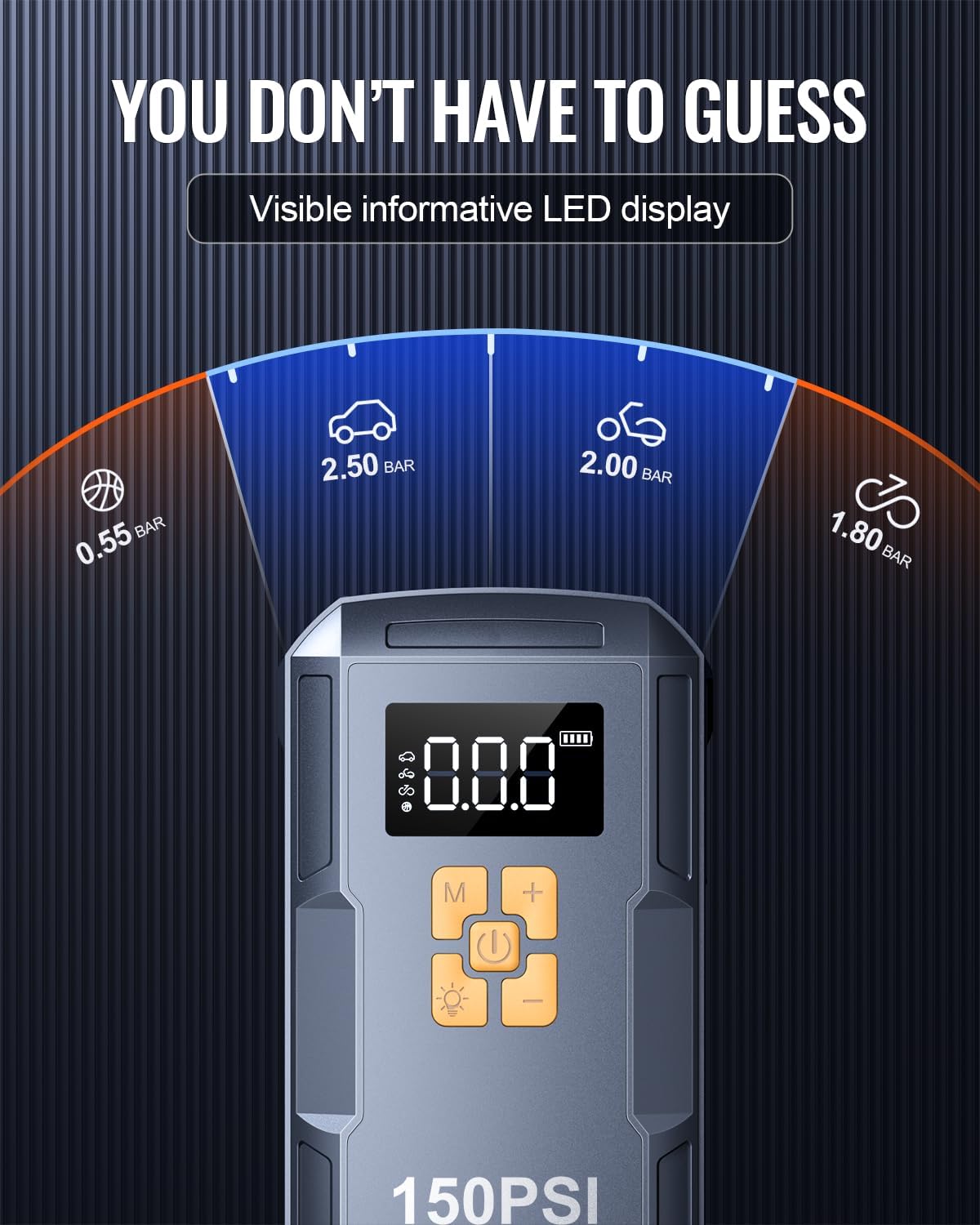 - Smart Cordless Inflator With LCD Screen: Smart preset & auto shut-off without repeated adjustment and check. Large LCD display to read real-time data, 4 optional inflation modes and pressure units switch for easy use. A powerful 150 PSI air compressor can fill a car tire to 20 PSI in just 2 minutes.