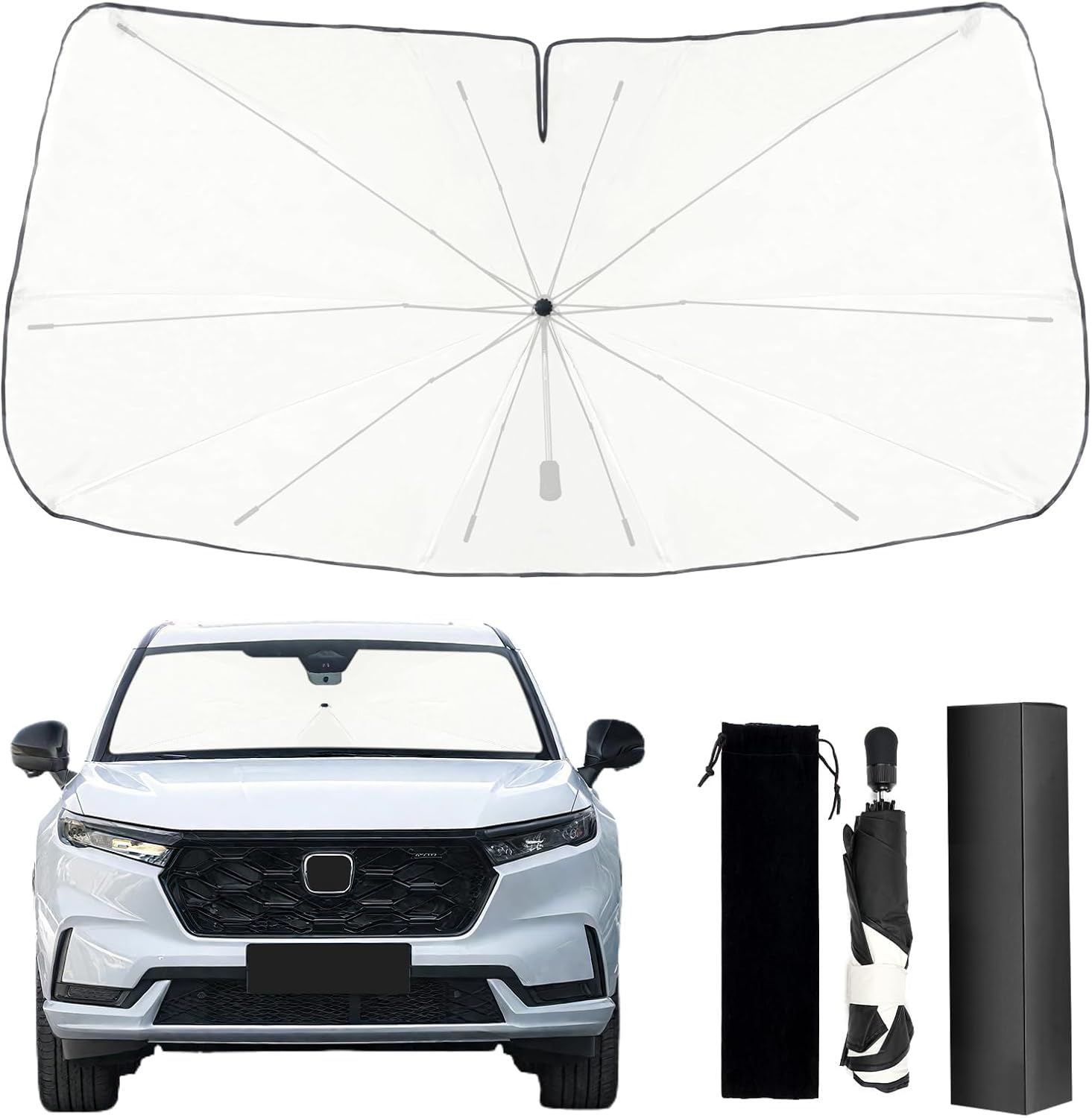 - DURABILITY: Built with 10 robust umbrella ribs, this front windshield umbrella sunshade is extremely sturdy. The bendable tubes can be flexed 360°, and the silicone tips protect your car's interior from scratches and damage, ensuring long-lasting use and peace of mind.