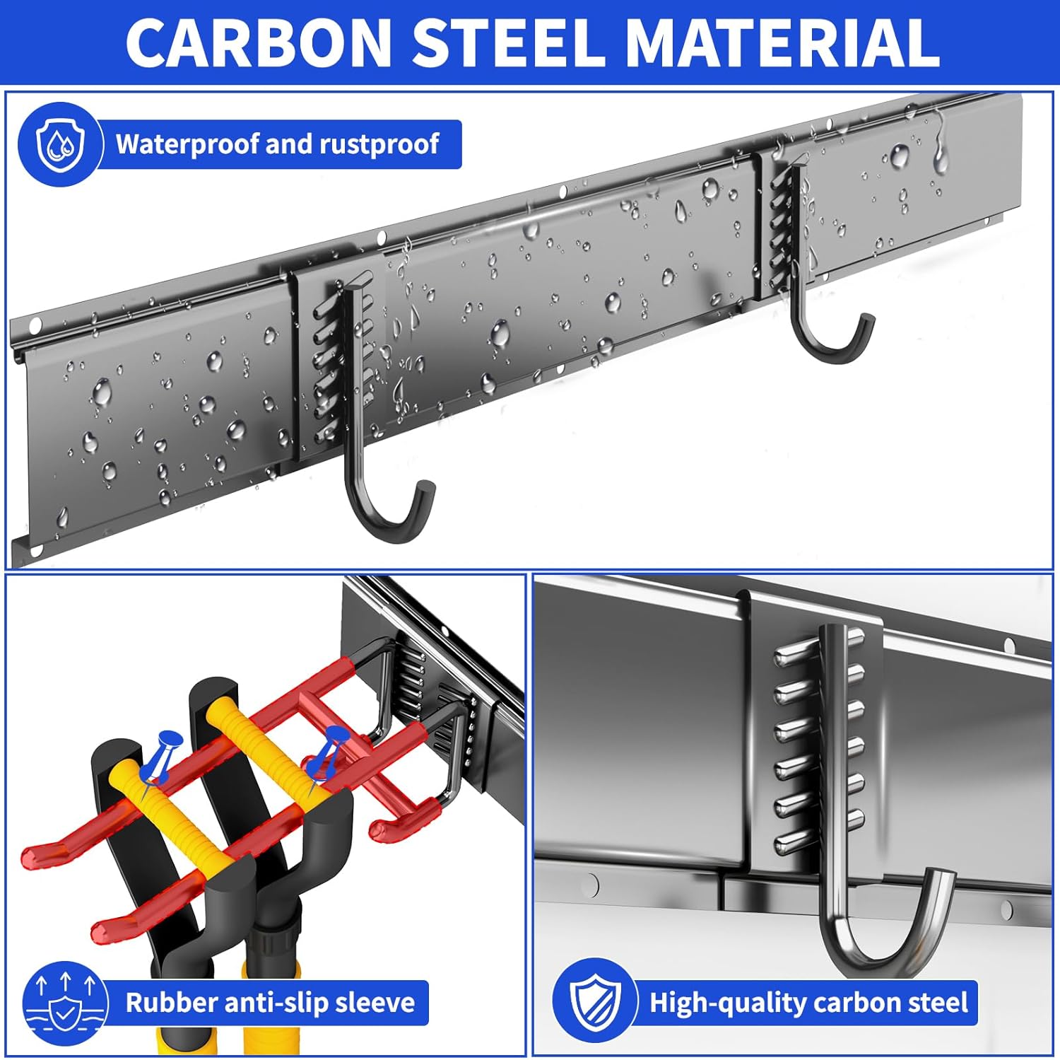 - HEAVY-DUTY 300 LBS CAPACITY: garage organizers and storage Constructed from premium steel with a rust-resistant, double powder-coated finish. Rubber-coated hooks prevent slipping. Built for long-lasting durability in your garage or garden