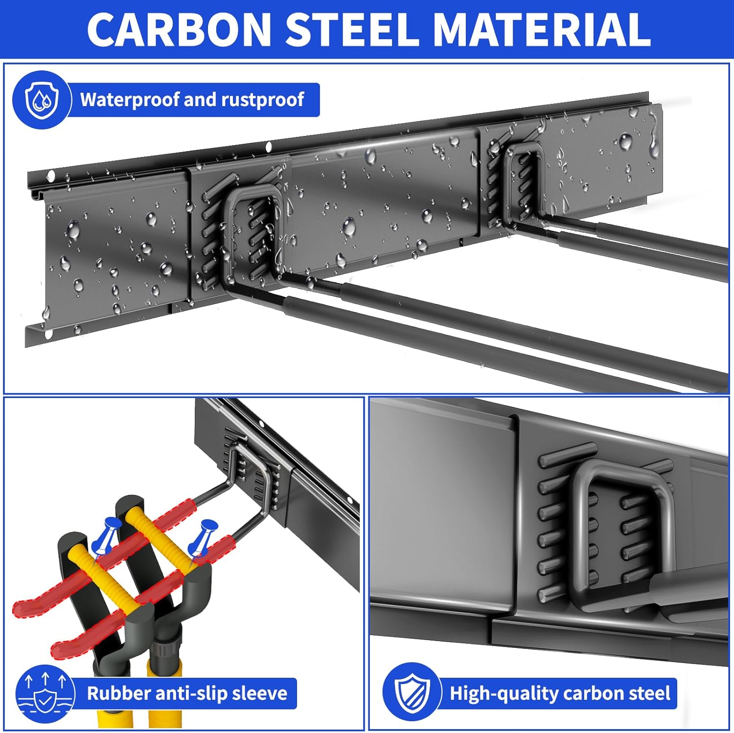 - HEAVY-DUTY 300 LBS CAPACITY: garage organizers and storage Constructed from premium steel with a rust-resistant, double powder-coated finish. Rubber-coated hooks prevent slipping. Built for long-lasting durability in your garage or garden