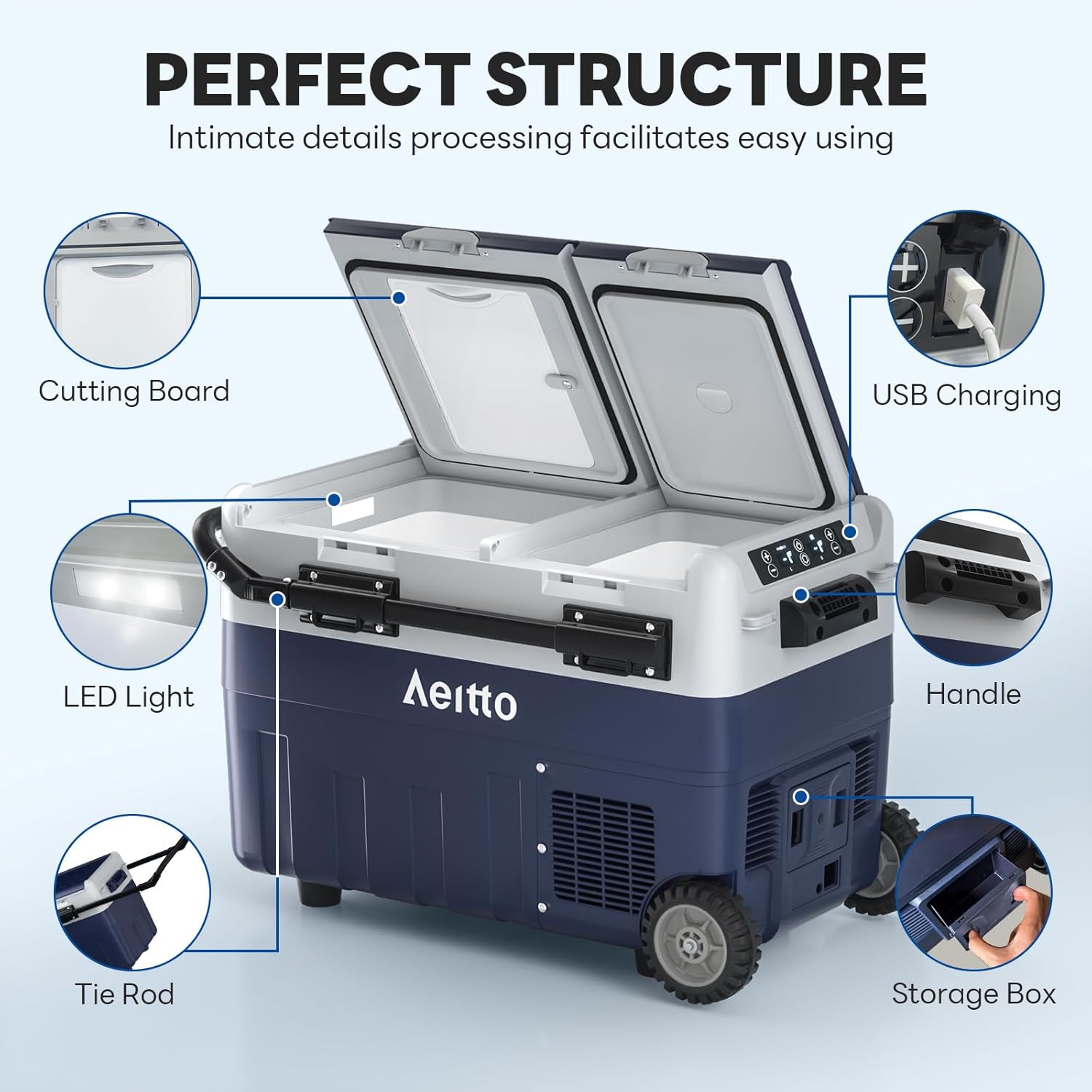 - User-Friendly Design: The freezer is equipped with retractable tie rods, sturdy wheels, and the handles to make it easy to move around at the campground or on the beach. The built-in utility cutting board to handle ingredients conveniently at all times. Built-in LED lighting improves visibility. The USB charging port for charging phones or other electronic devices. The removable refrigerator door makes it easy to clean. You can also change the opening method according to your needs or habit