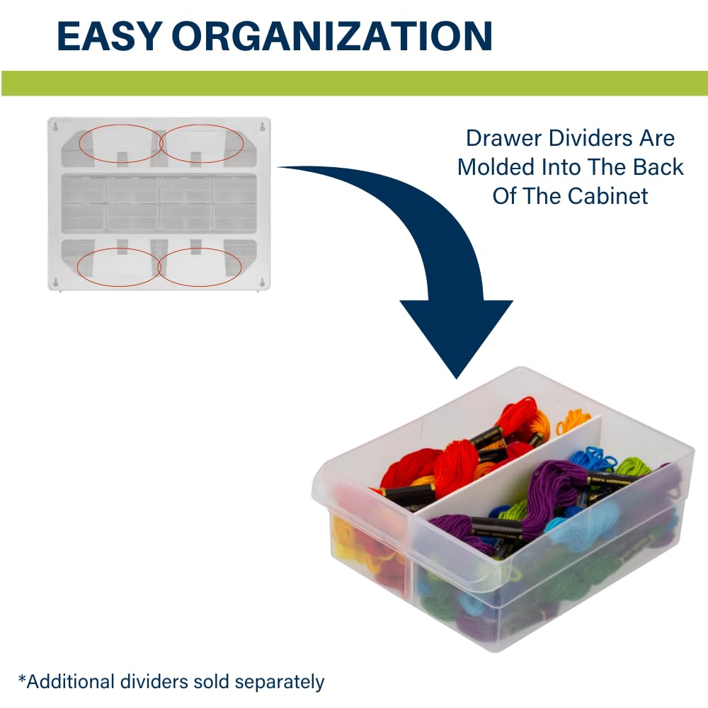 - FEATURES: Stack cabinets securely or use keyhole slots to mount for wall storage; Finger-grip drawer pulls provide easy access; Rear stop tabs prevent contents from spilling; Drawer dividers are included and molded into the back of the cabinet