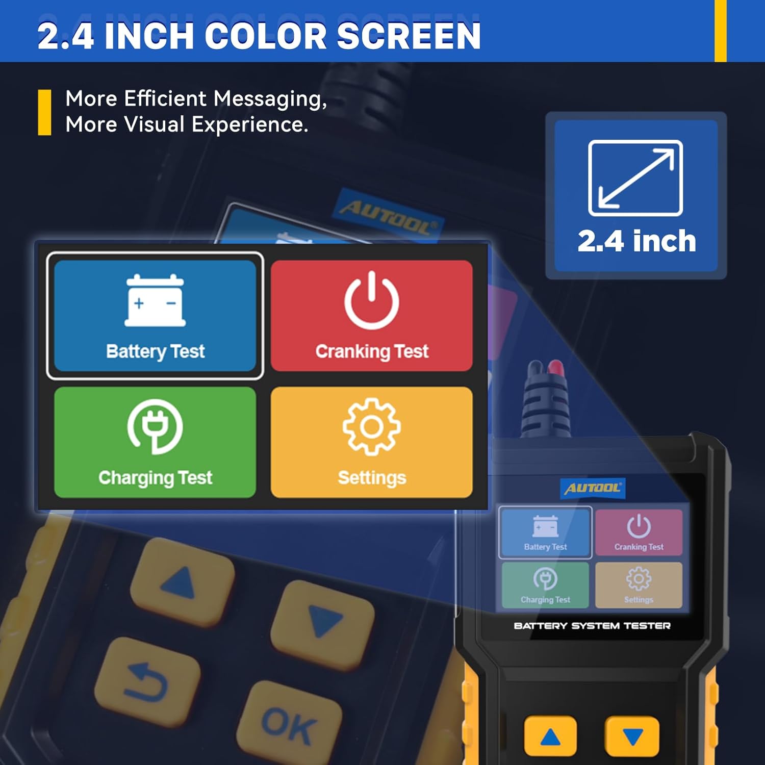 - 【Comprehensive System Test】Complete battery test, cranking system test and charging system test with one click, real-time display of key data such as voltage, internal resistance, starting minimum voltage, etc., intuitively determine whether the battery performance is good or not, and provide maintenance recommendations to improve diagnostic efficiency.
