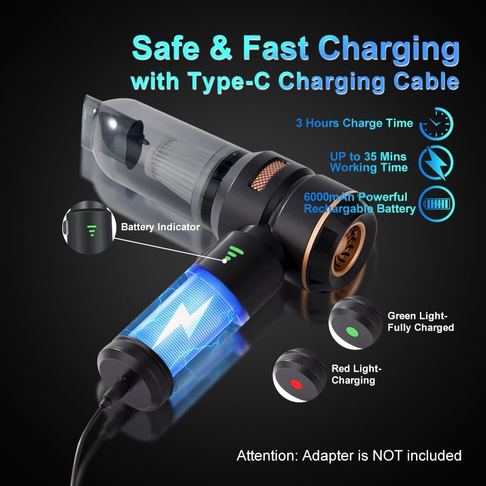 - [Safe & Convenient Charge]- The handheld vacuum cleaner uses a 6000mAh capacity battery and supports fast Type-C charging. The high compatibility of the charging port makes it convenient for the vacuum to be charged anywhere like at home, in the car or outdoors with your laptop. It usually takes 3 hours to charge the vacuum fully. You can use the fully charged vacuum for up to 35 minutes.