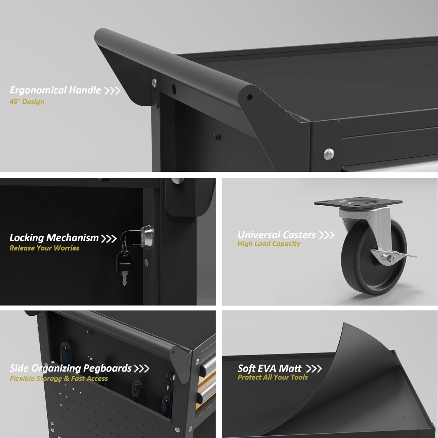 - Industrial Grade Steel: Crafted from high-quality cold-rolled steel with a rust-resistant coating, our mechanic tool cart ensures exceptional durability. As a robust power tool organizer cart and power tool storage rack, it boasts an impressive weight capacity of 400 lbs, making it reliable for heavy-duty tasks.