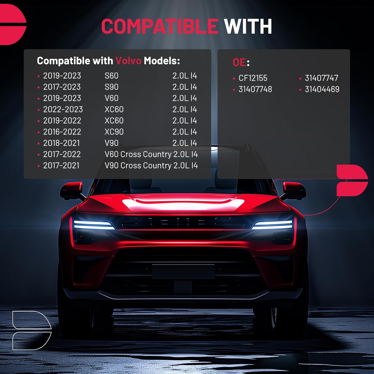 - [Vehicle Fitment] Compatible with Volvo Models: 2019-2023 S60/V60 2.0L l4, 2017-2023 S90 2.0L l4, 2017-2022 V60 Cross Country 2.0L l4, 2018-2021 V90 2.0L l4, 2017-2021 V90 Cross Country 2.0L l4, 2019-2023 XC60 2.0L l4, 2016-2023 XC90 2.0L l4