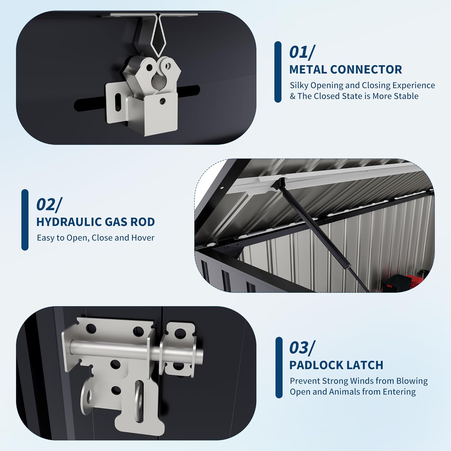 - 2 CHAINS & AIR VENTS DESIGN - This garbage bin shed stores has a preset iron chain hole on the cover, which can be linked to the trash can cover with an iron chain. In addition, the top cover can be held in mid air without the need to be lifted by hand, as it is equipped with a high quality, long life pneumatic rod. It opens the trash can simultaneously, which is convenient for dumping garbage. Equipped with 2 vents, it facilitates air circulation, preventing excessive humidity in hot or humid w