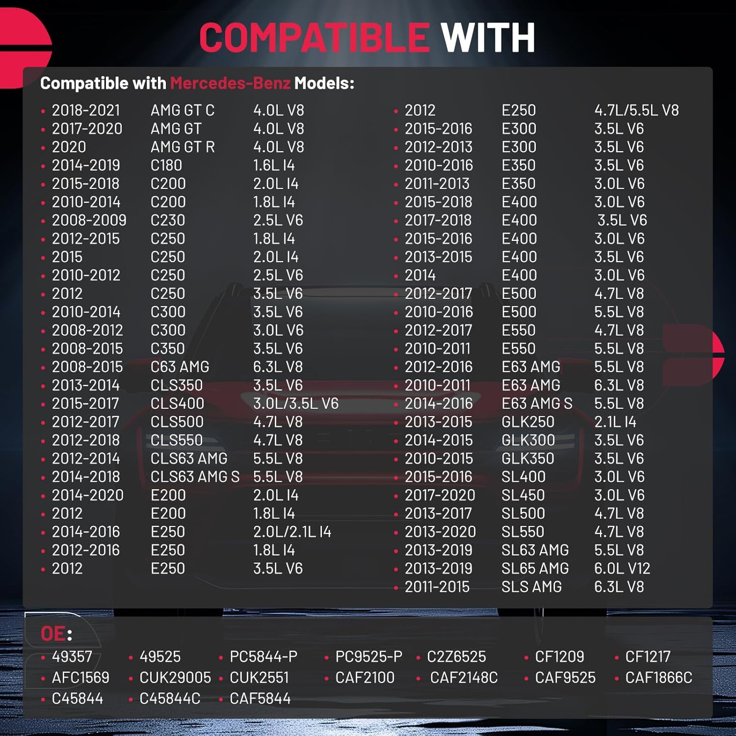 - [Replaces Part] 49357, 49525, PC5844-P, PC9525-P, C2Z6525, CF1209, CF1217, AFC1569, CUK29005, CUK2551, CAF2100, CAF2148C, CAF9525, CAF1866C, C45844, C45844C, CAF5844. Compatible with Mercedes-Benz Models: 2014-2015 GLK300, 2010-2015 GLK350, 2015-2016 SL400, 2017-2020 SL450, 2013-2017 SL500, 2013-2020 SL550, 2013-2019 SL63 AMG/SL65 AMG, 2011-2015 SLS AMG