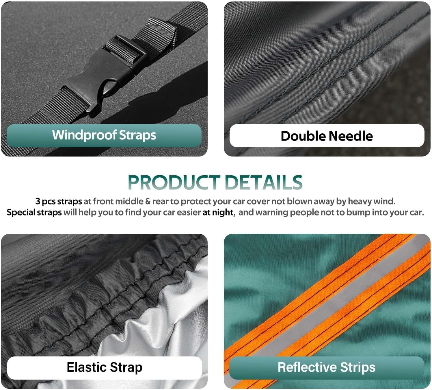 - 【PRODUCT DETAILS】:1.The car cover has three pairs of windproof straps, each pair of windproof straps is reinforced, even in windy weather will not be blown away. 2.With fluorescent orange designs, it can glow at night to avoid accidental impact.
