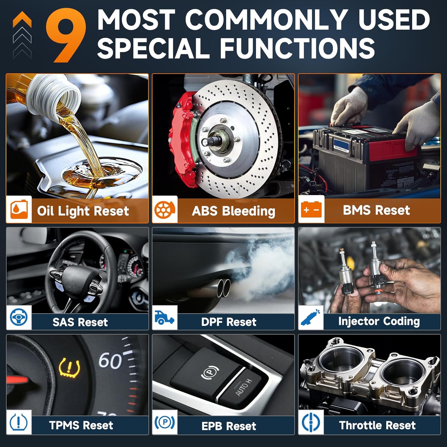 - 9 Essential Service Reset Functions - Go beyond basic car diagnostic scanners with 9 advanced resets including ABS Bleeding, Oil Light Reset, EPB, BMS, DPF, Throttle Relearn, Injector Coding, TPMS, and SAS. Perform essential maintenance and clear stubborn warning lights on your own. 👉Please note: This car scanner diagnostic tool does not support key programming.