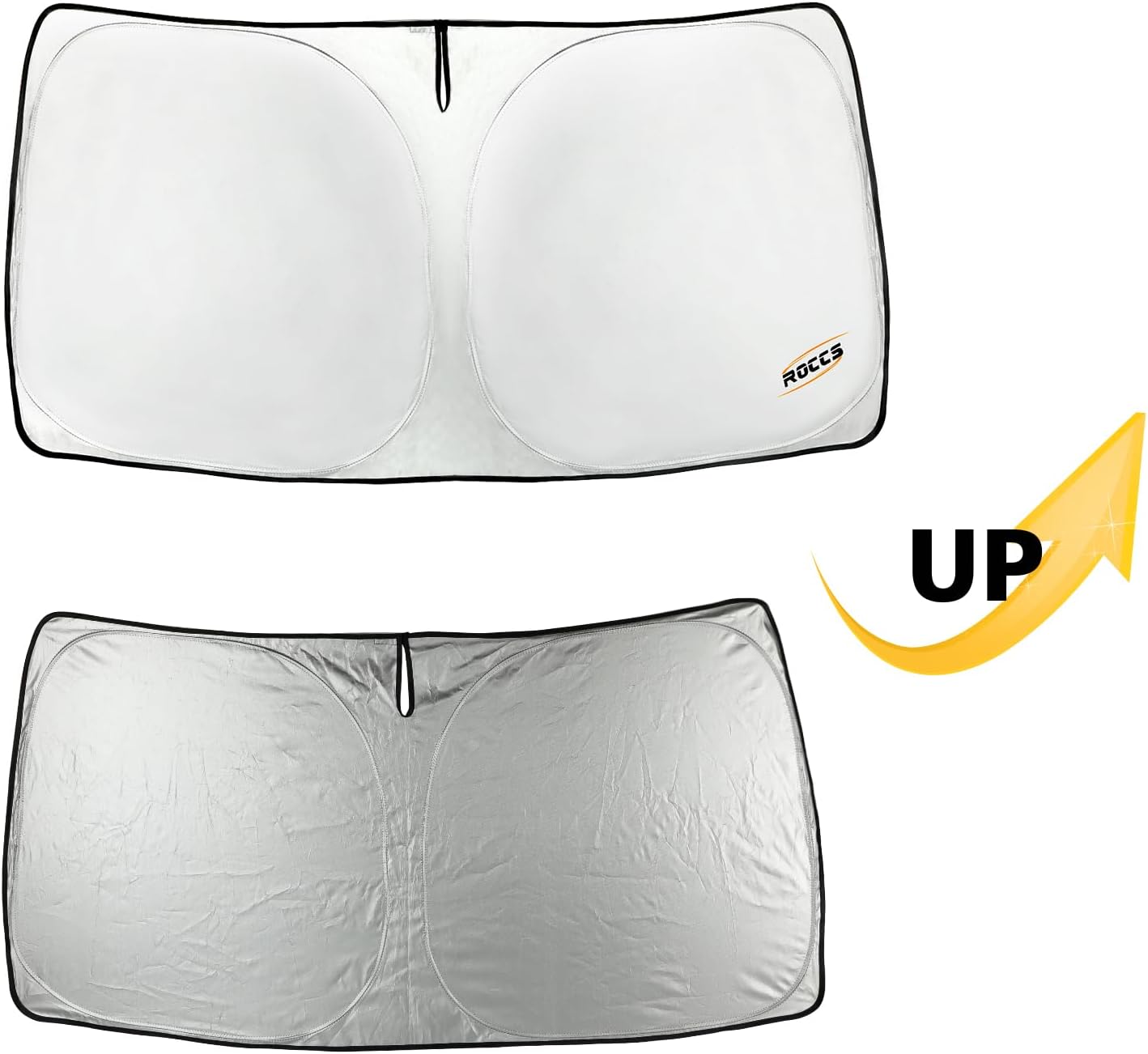 - UV Protective Barrier: ROCCS foldable 4runner sun shade utilizes premium 240T polyester UV-reflective fabric to effectively block 100% of harmful UV rays and solar heat radiation, safeguarding your dashboard, steering wheel, and leather seats from sun-induced fading and cracking.