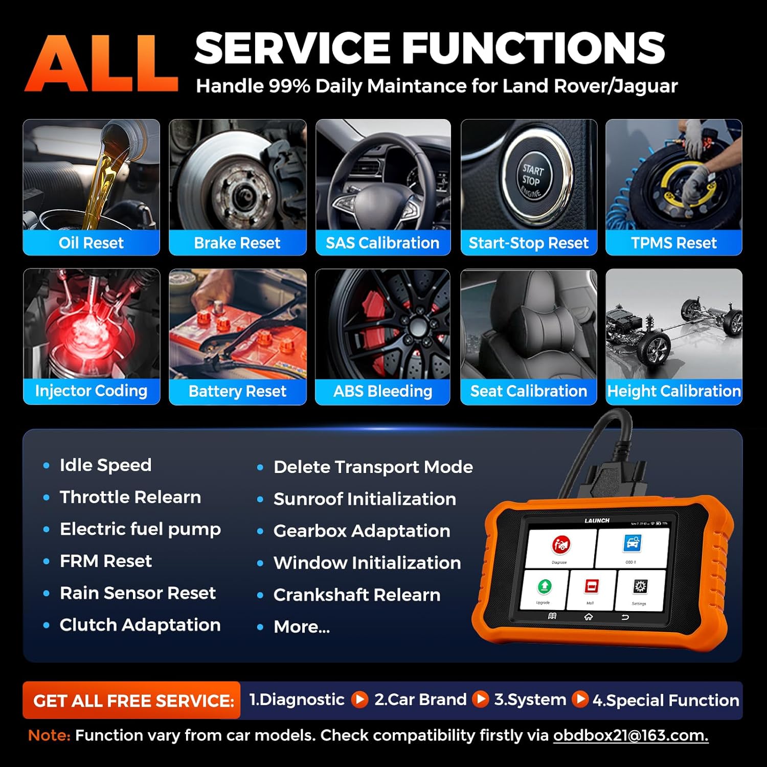 - 【ALL FREE MAINTENANCE SERVICE】 LAUNCH Creader Elite V2.0 diagnostic scan tool offers ALL FREE Services for Land Rover Jaguar, make daily repair a breeze, such as Oil, EPB, Battery, SAS, Injector Coding, Throttle Relearn, Height Calibration, Transmission Adaption, Crankshaft/Camshaft Relearn, Sunroof Calibration, etc. Save your ton of repairing buck from dealership. 🚩Get All services from "Diagnose>Brand>System Selection>Special Function". Check compatibility via 📩 obdbox21 @ 163 . com firstly.