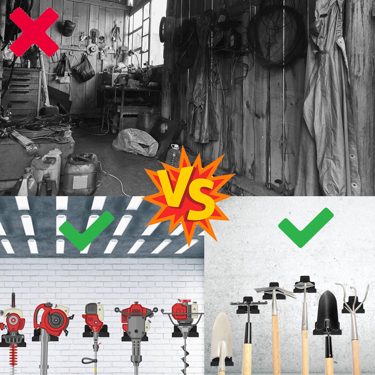 - 【Versatile & Space-Saving Garage Organizer】This wall-mounted tool rack securely holds weed whackers, grass trimmers, hoses, power tools, and more! Perfect for garages, gardens, basements, or warehouses, its multi-purpose design maximizes vertical storage, keeping your space clutter-free.