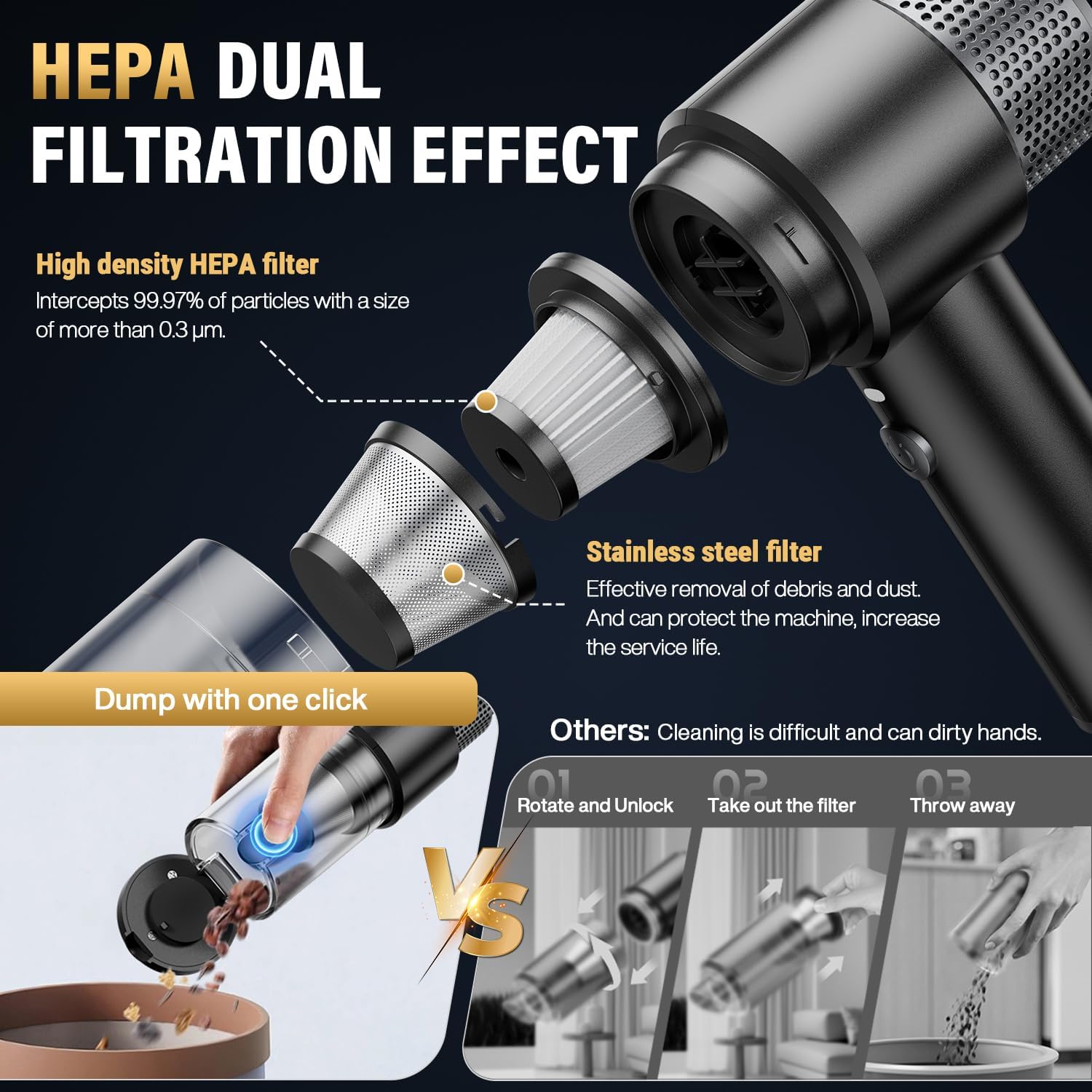 - 【Dual-Layer Filtration: Stainless Steel + HEPA】A breakthrough in filtration technology, our two-stage system combines a durable stainless steel mesh filter and a replaceable HEPA paper filter. The pre-filter traps large particles like hair and crumbs, extending the HEPA filter’s lifespan by blocking 99% of debris before it reaches the second layer. The airtight design prevents particle leakage during operation or disposal, while the transparent dustbin lets you monitor fill levels. Regular cleaning every 2-3 weeks maintains optimal airflow